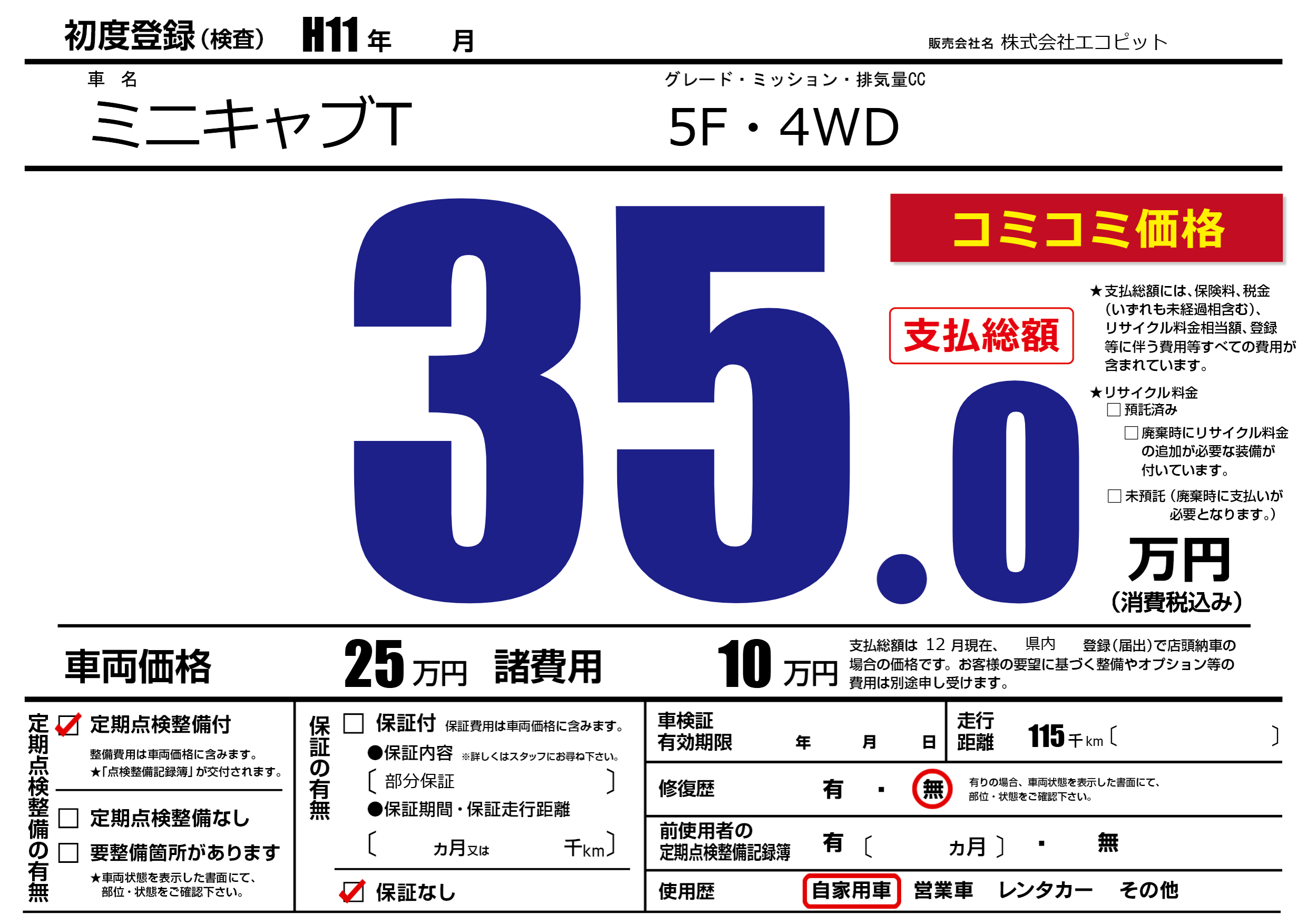 | 車名 | ミニキャブT | グレード ミッション 排気量 |