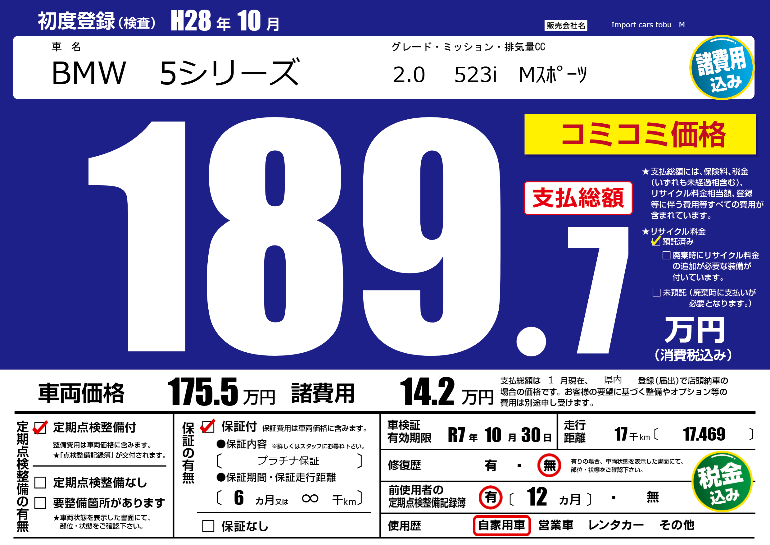 | 車名 | BMW 5シリーズ | グレード ミッション 排気量 |