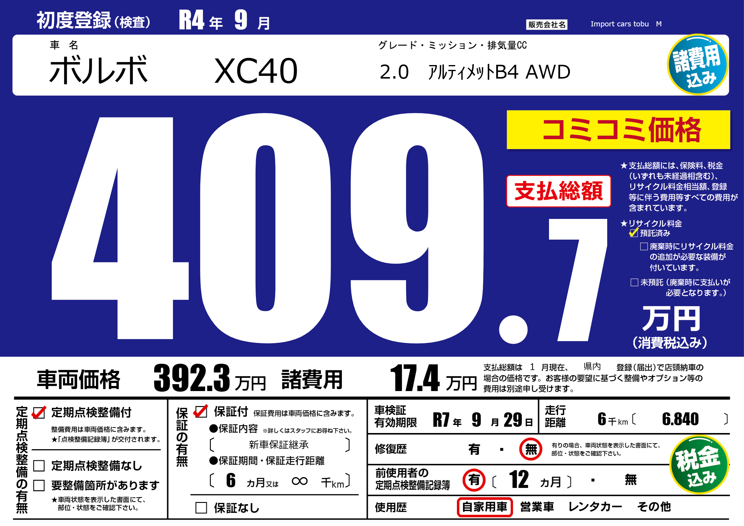 保証付き 保証内容( 新車保証継承) 6ヶ月または(∞)千kmまで |