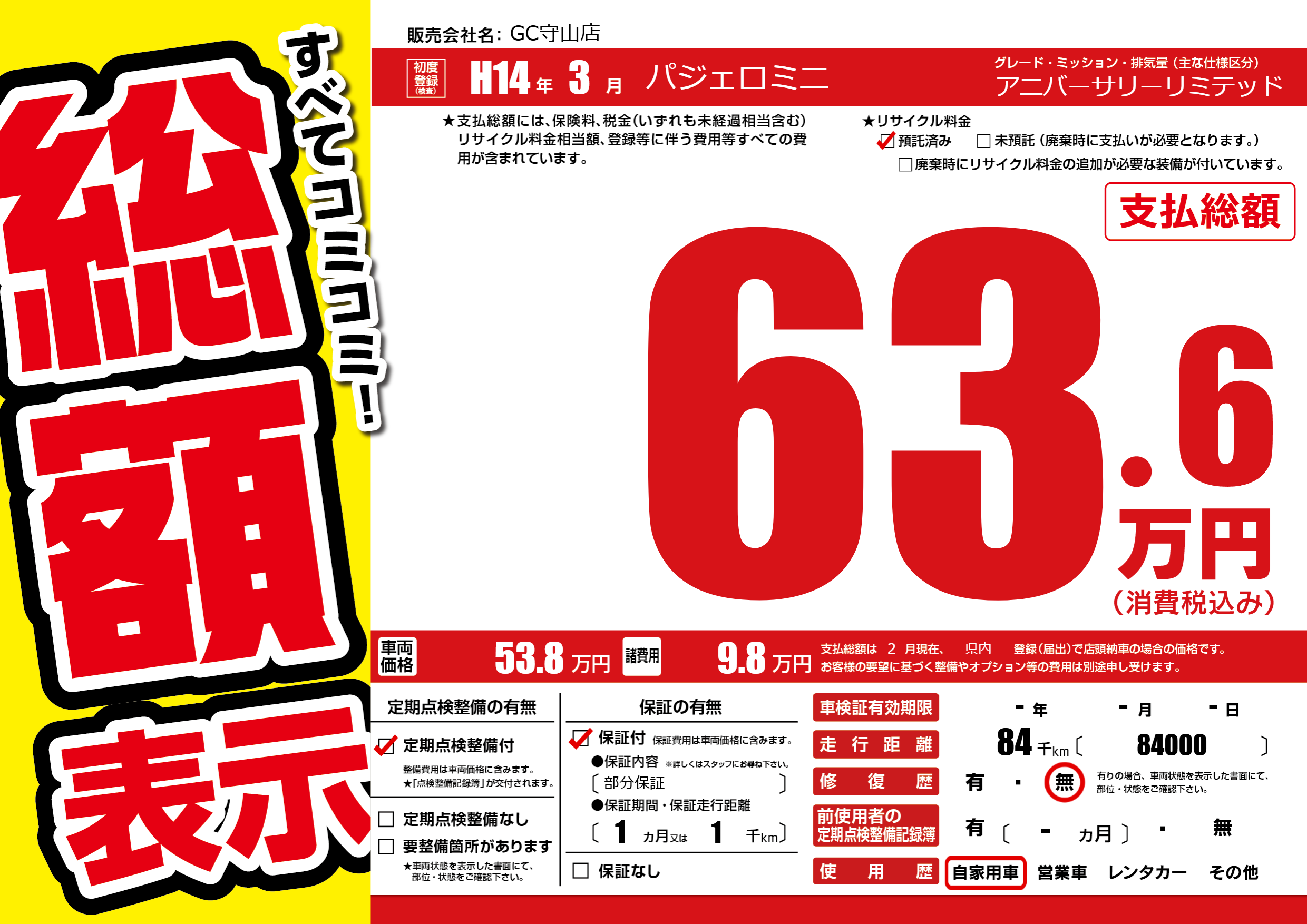 | 車名 | パジェロミニ | グレード ミッション 排気量 |