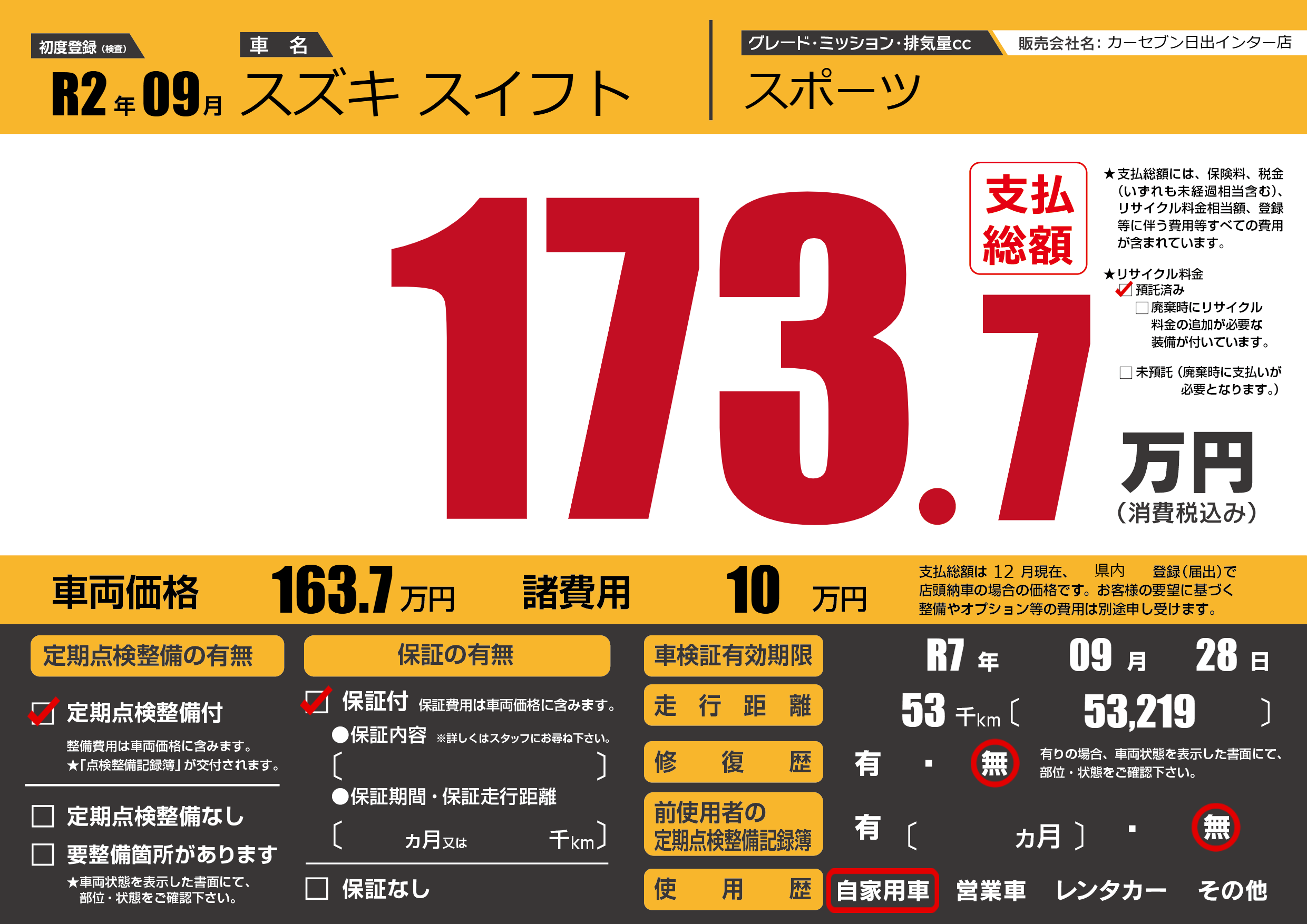 | 車名 | スズキ スイフト | グレード ミッション 排気量 |