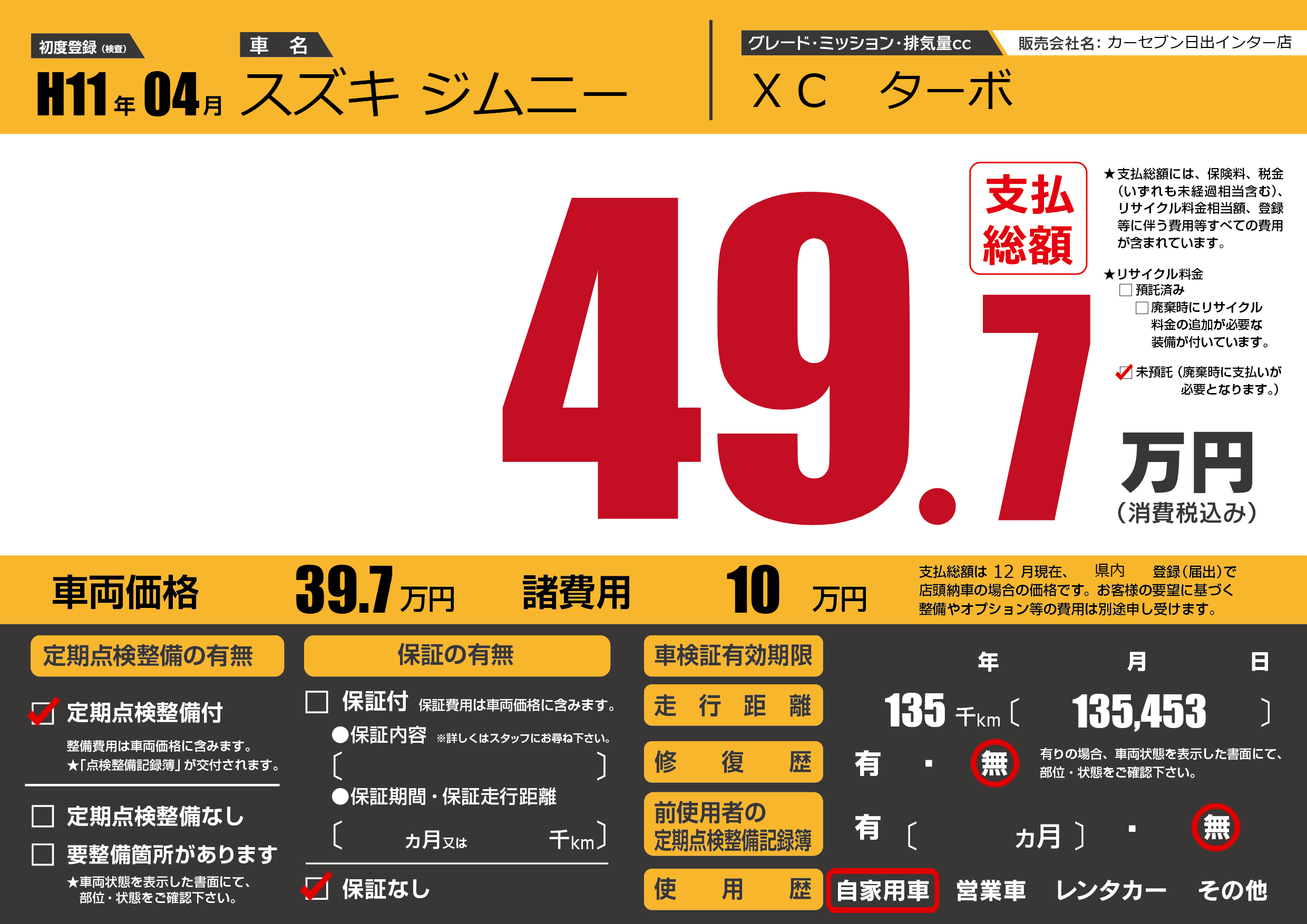 | 走行キロ | 13.5万km | 初年度登録 | H11年04月 |