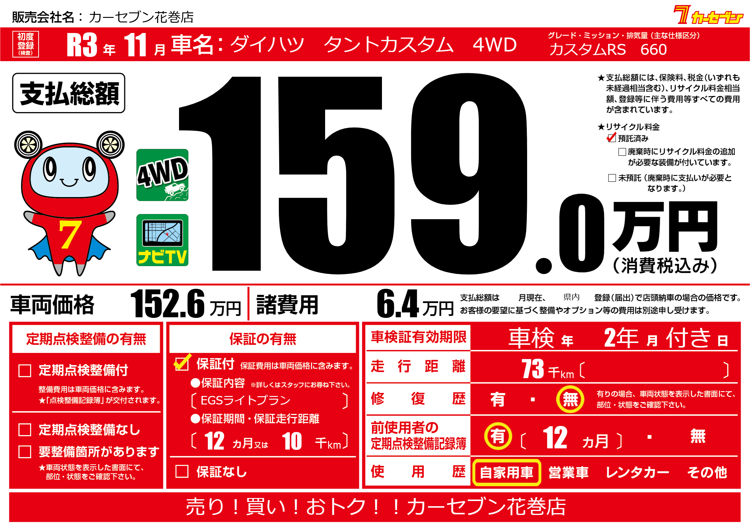 | 走行キロ | 7.3万km | 初年度登録 | R3年11月 |