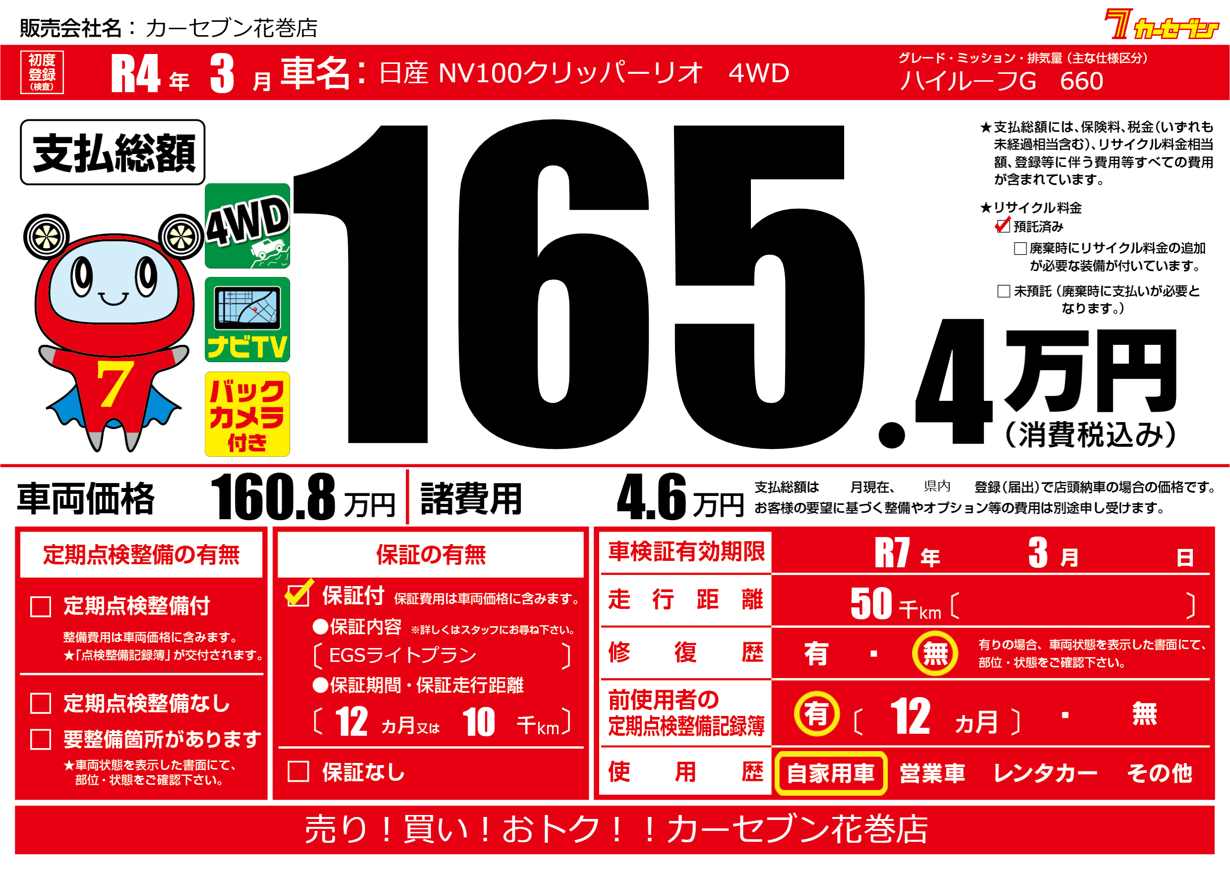 | 車名 | 日産 NV100クリッパーリオ 4WD | グレード ミッション 排気量 |