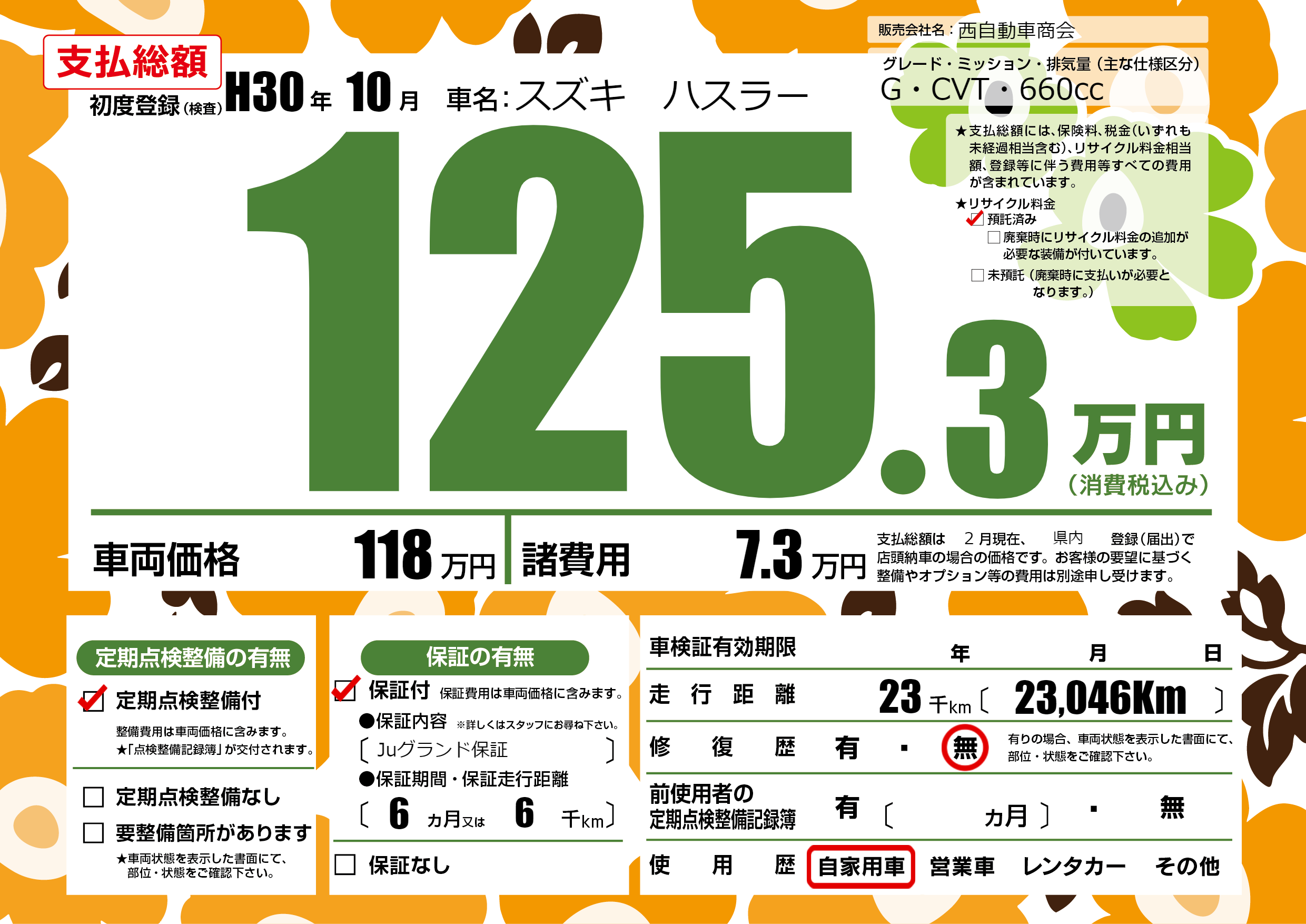 | 車名 | スズキ ハスラー | グレード ミッション 排気量 |