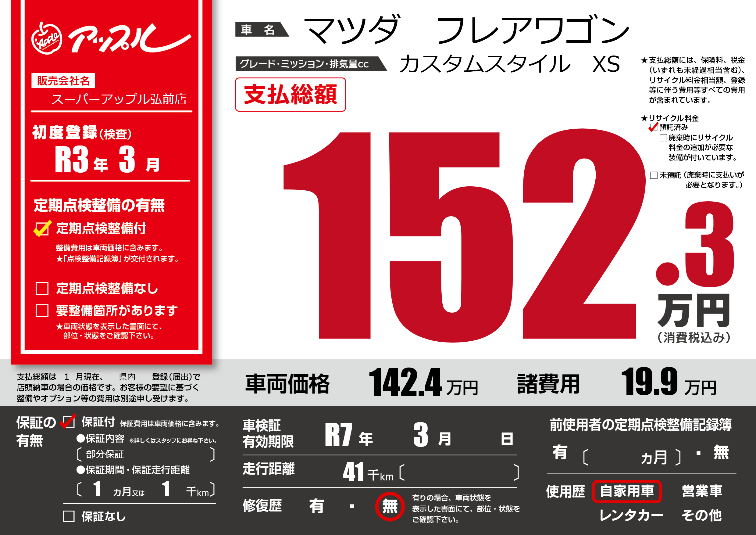 | 車名 | マツダ フレアワゴン | グレード ミッション 排気量 |