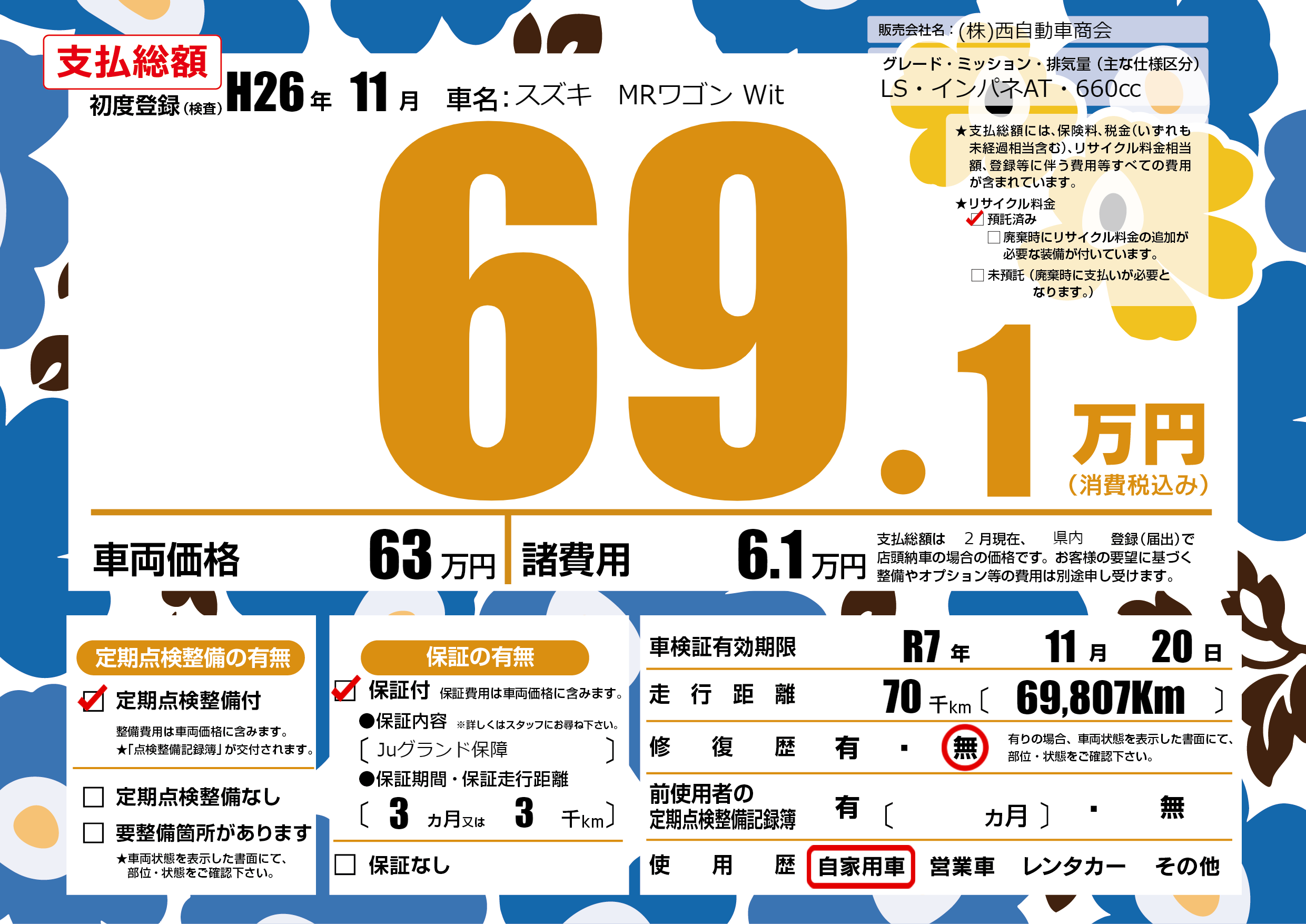 | 走行キロ | 7万km | 初年度登録 | H26年11月 |
