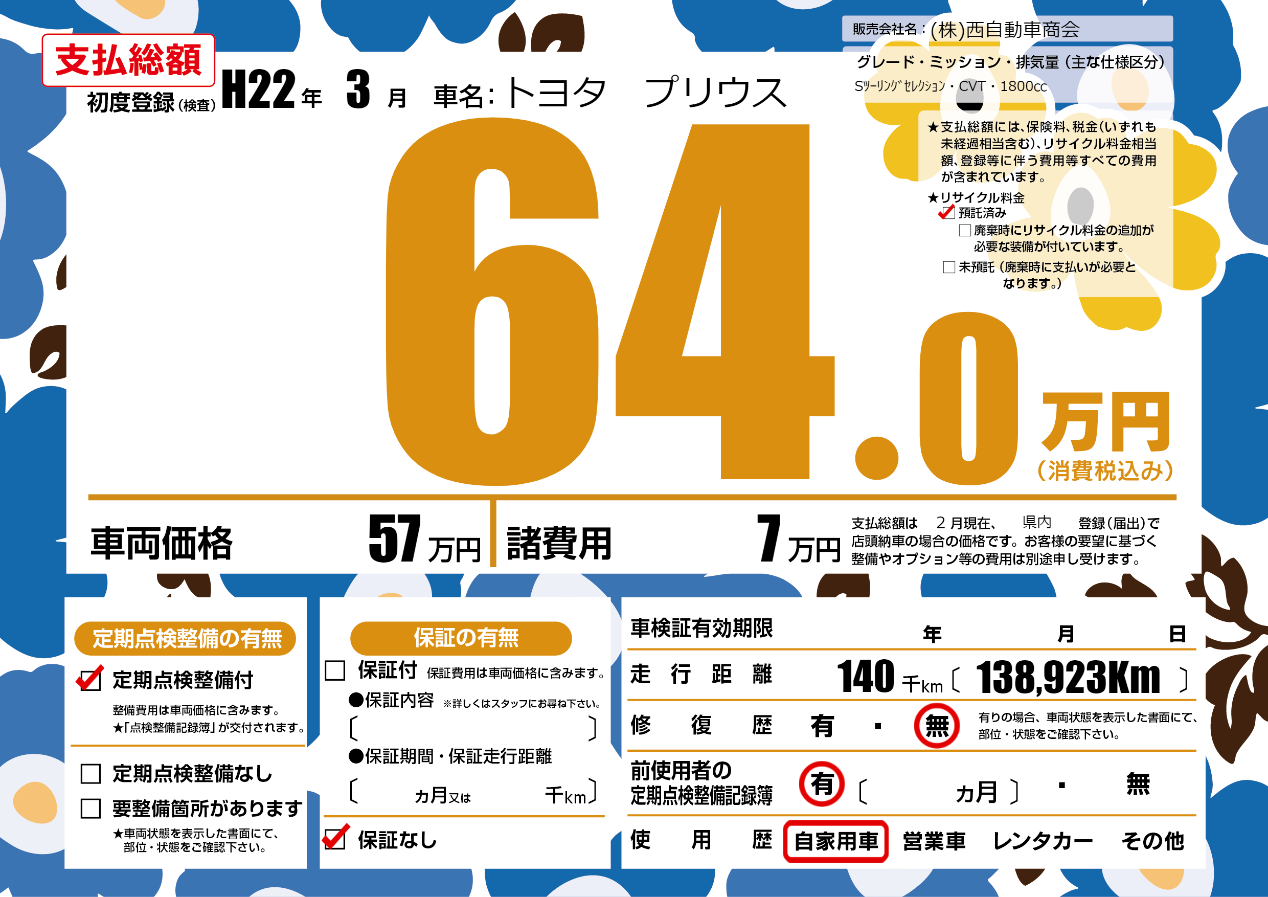 | 車名 | トヨタ プリウス | グレード ミッション 排気量 |
