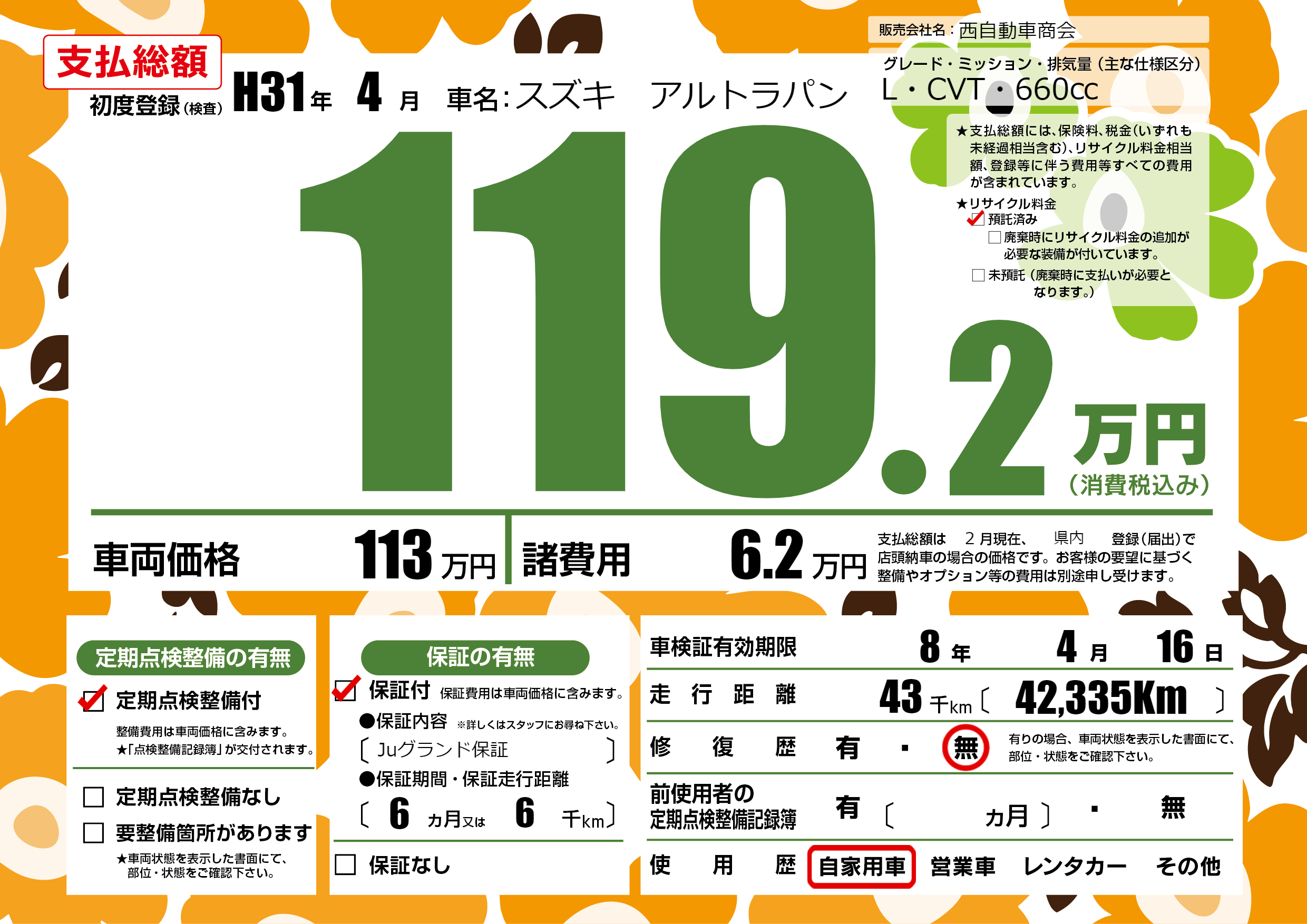 保証付き 保証内容(Juグランド保証) 6ヶ月または(6)千kmまで |