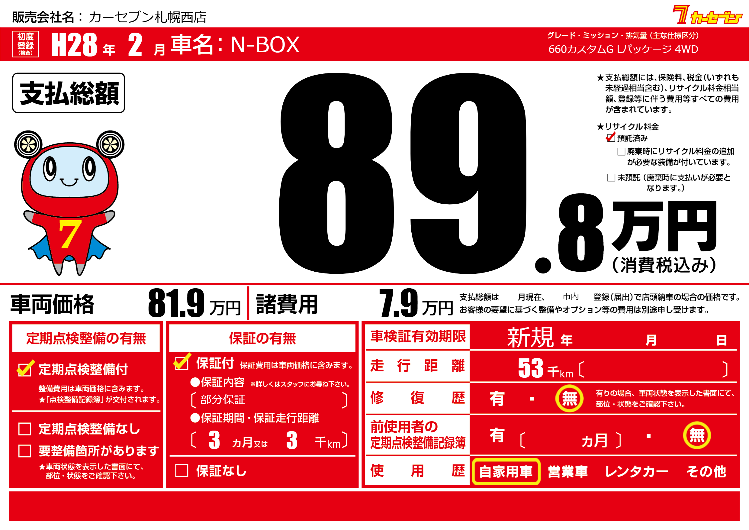 | 車名 | N-BOX | グレード ミッション 排気量 |