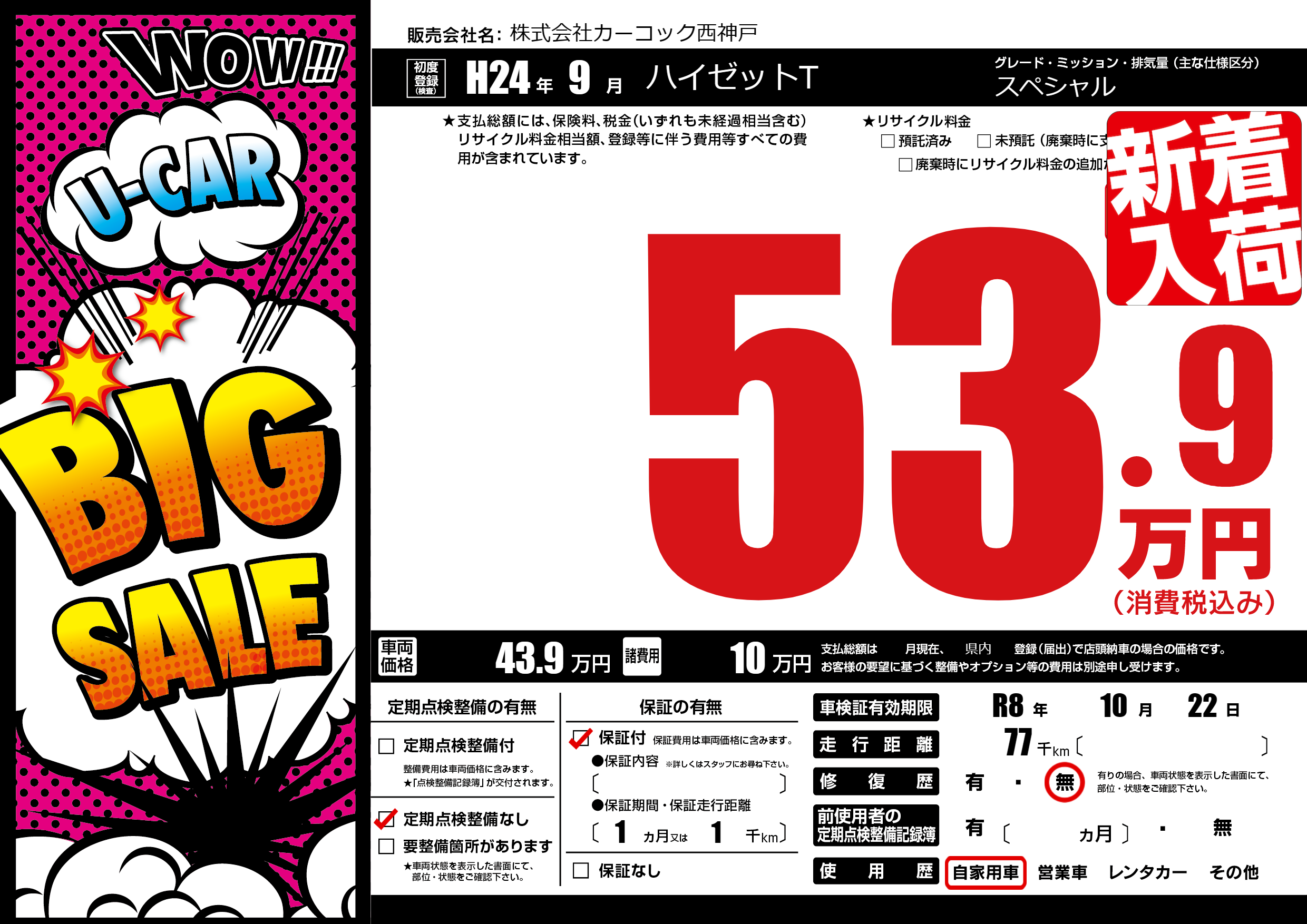 | 走行キロ | 7.7万km | 初年度登録 | H24年9月 |