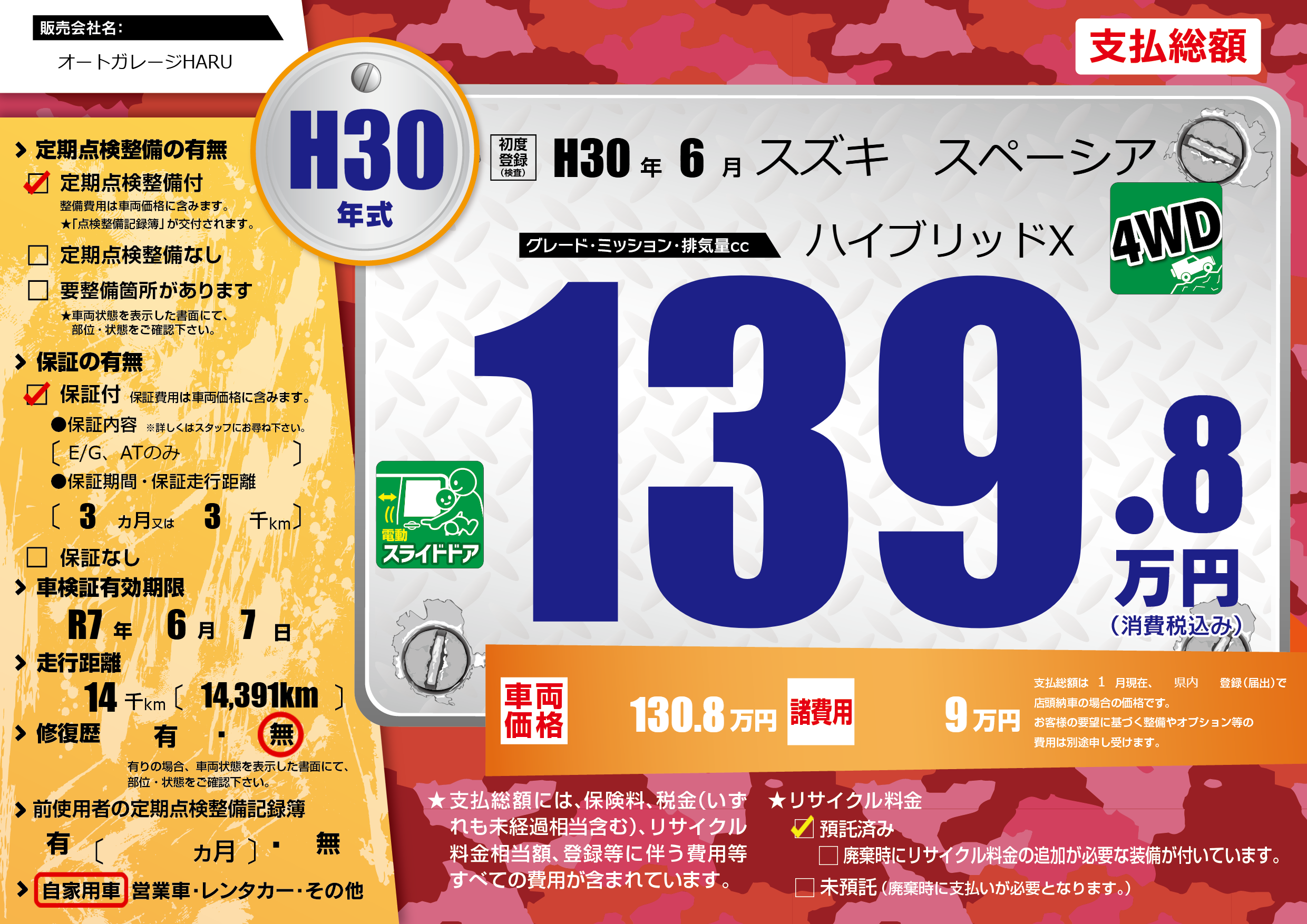 | 走行キロ | 1.4万km | 初年度登録 | H30年6月 |