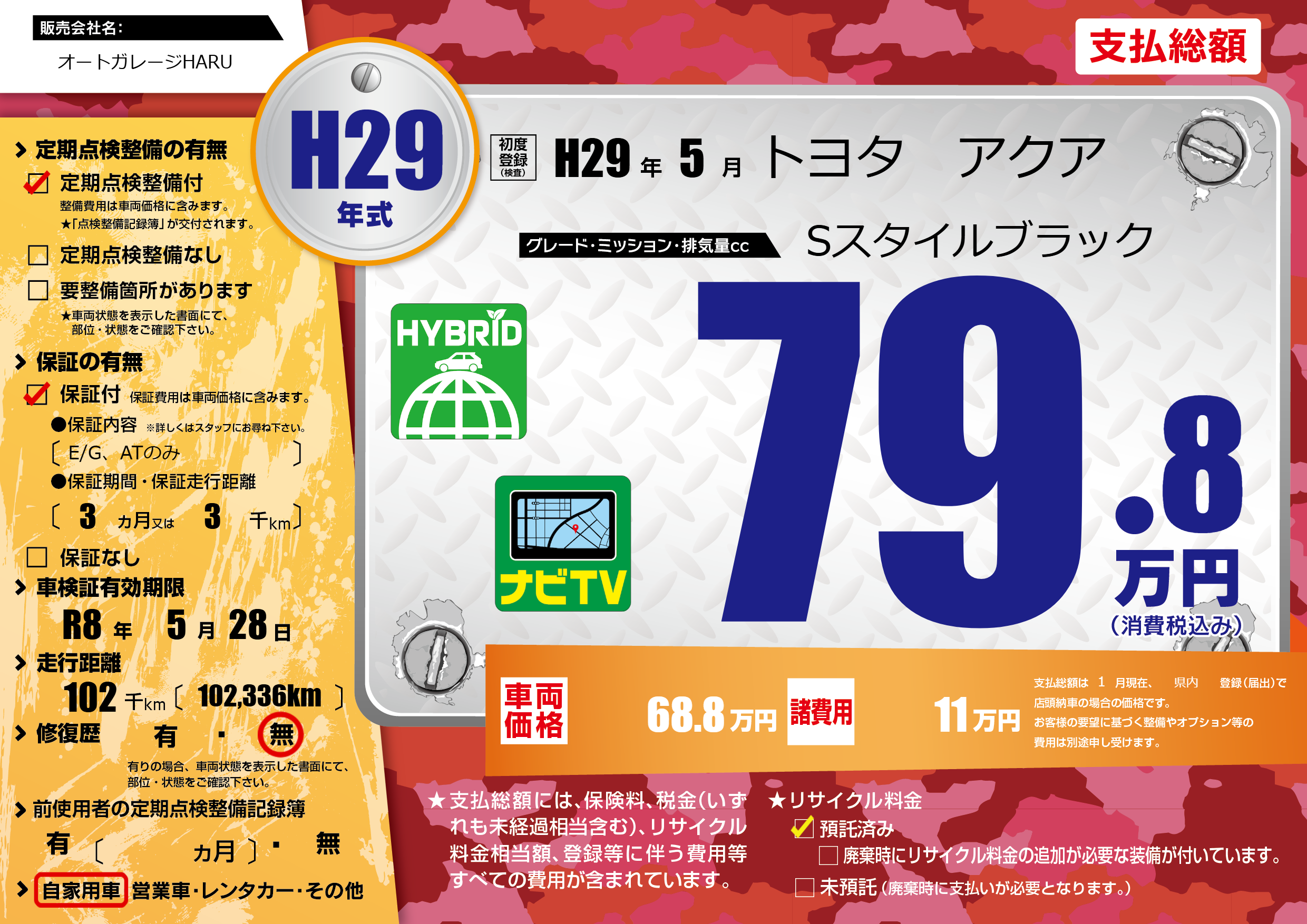 | 車名 | トヨタ アクア | グレード ミッション 排気量 |