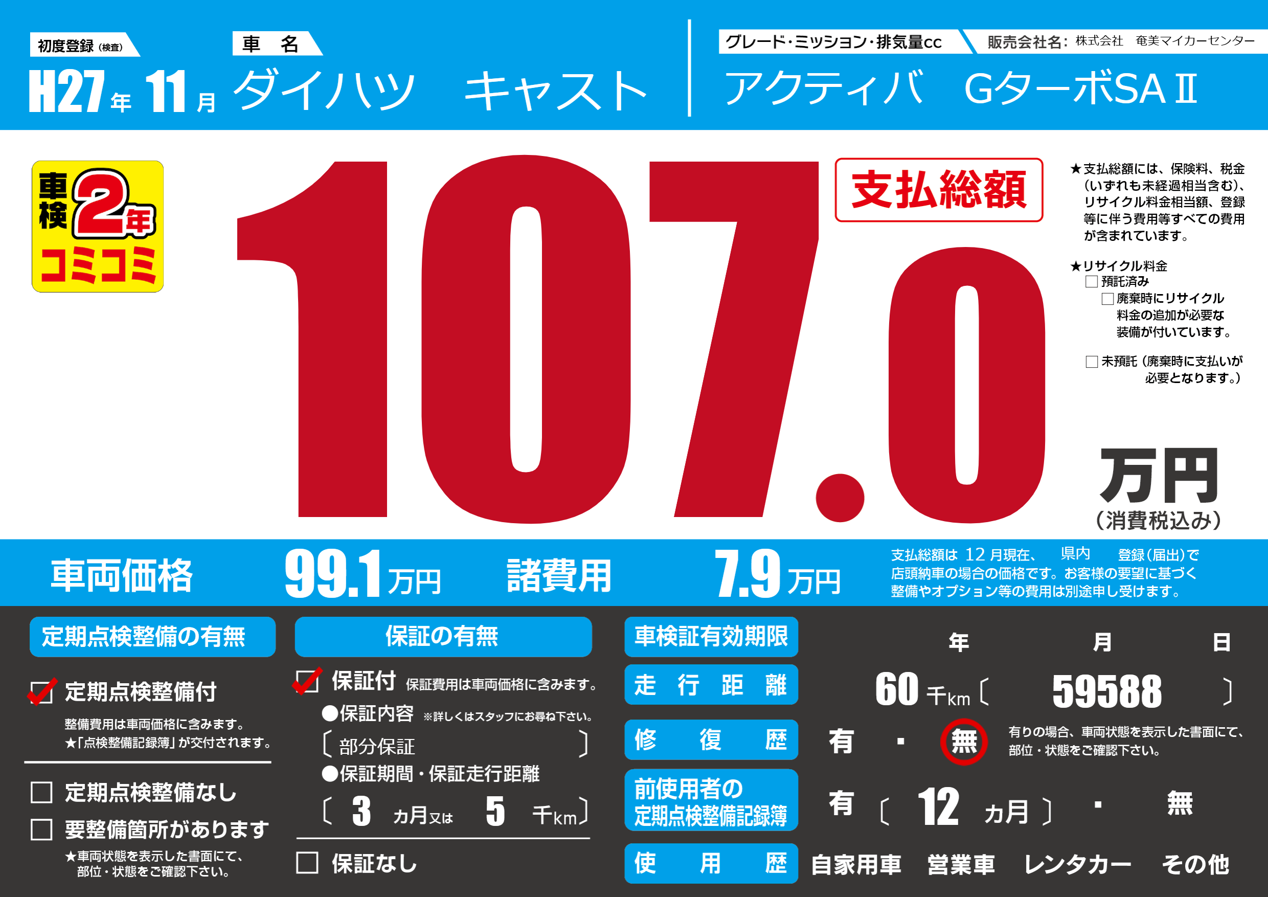| 走行キロ | 6万km | 初年度登録 | H27年11月 |