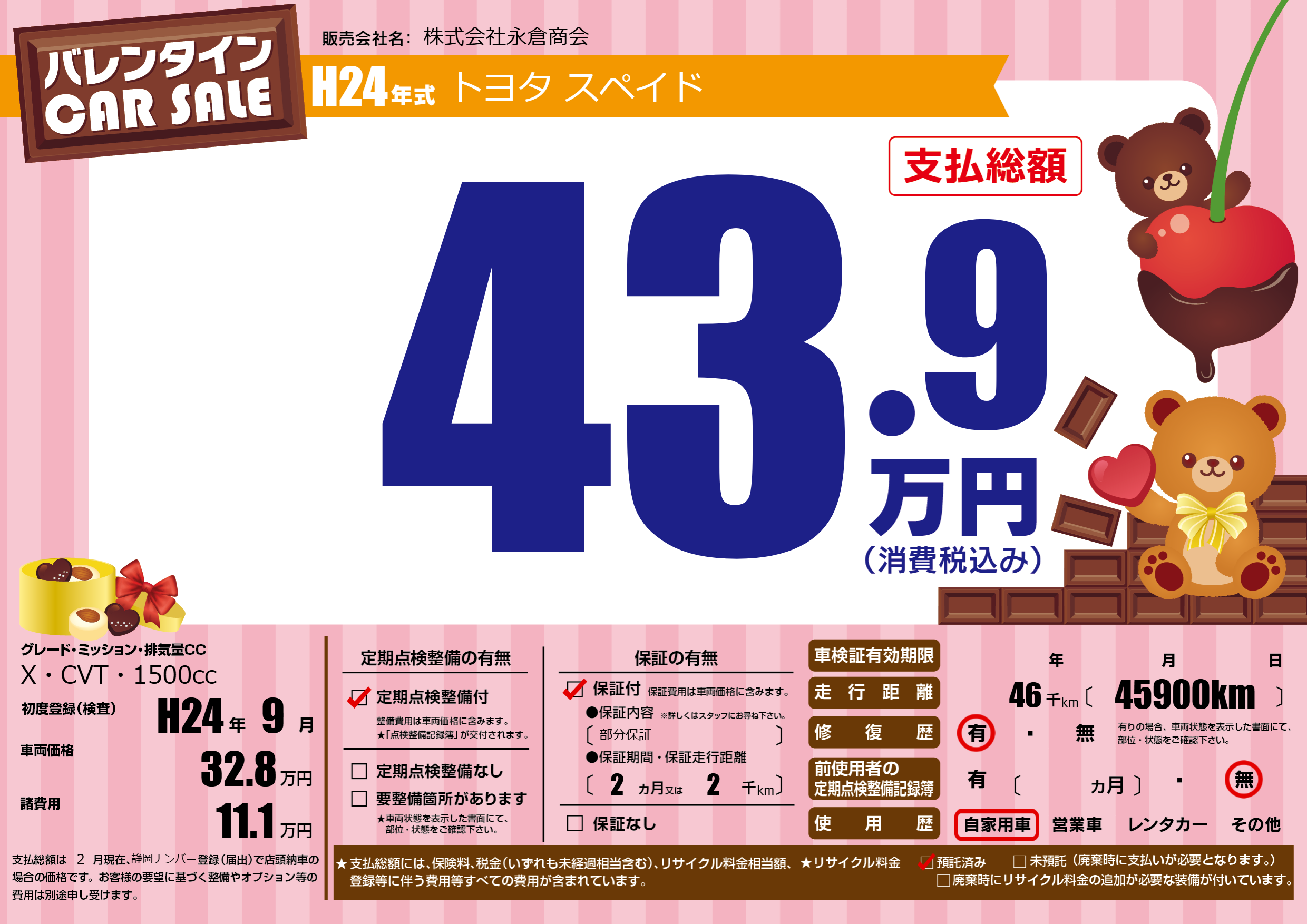 | 車名 | トヨタ スペイド | グレード ミッション 排気量 |