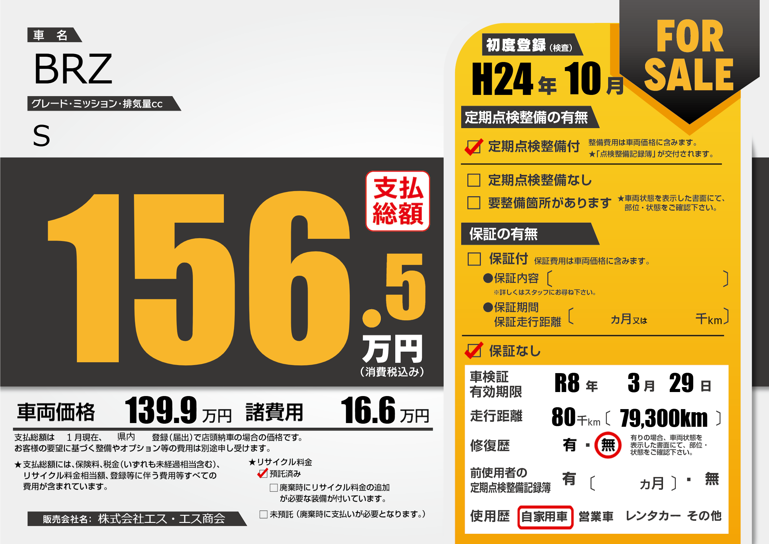 | 車名 | BRZ | グレード ミッション 排気量 |