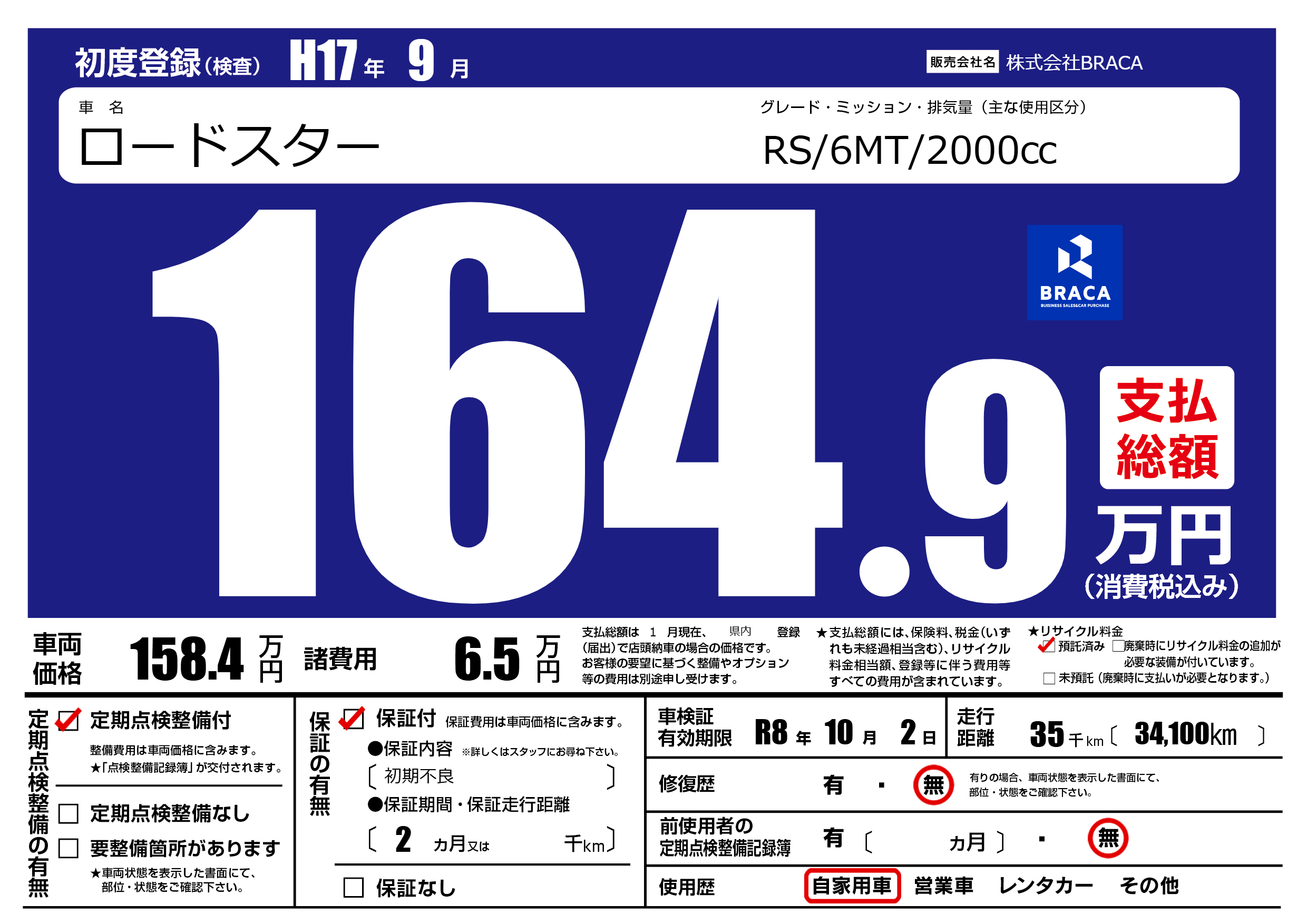 | 走行キロ | 3.5万km | 初年度登録 | H17年9月 |