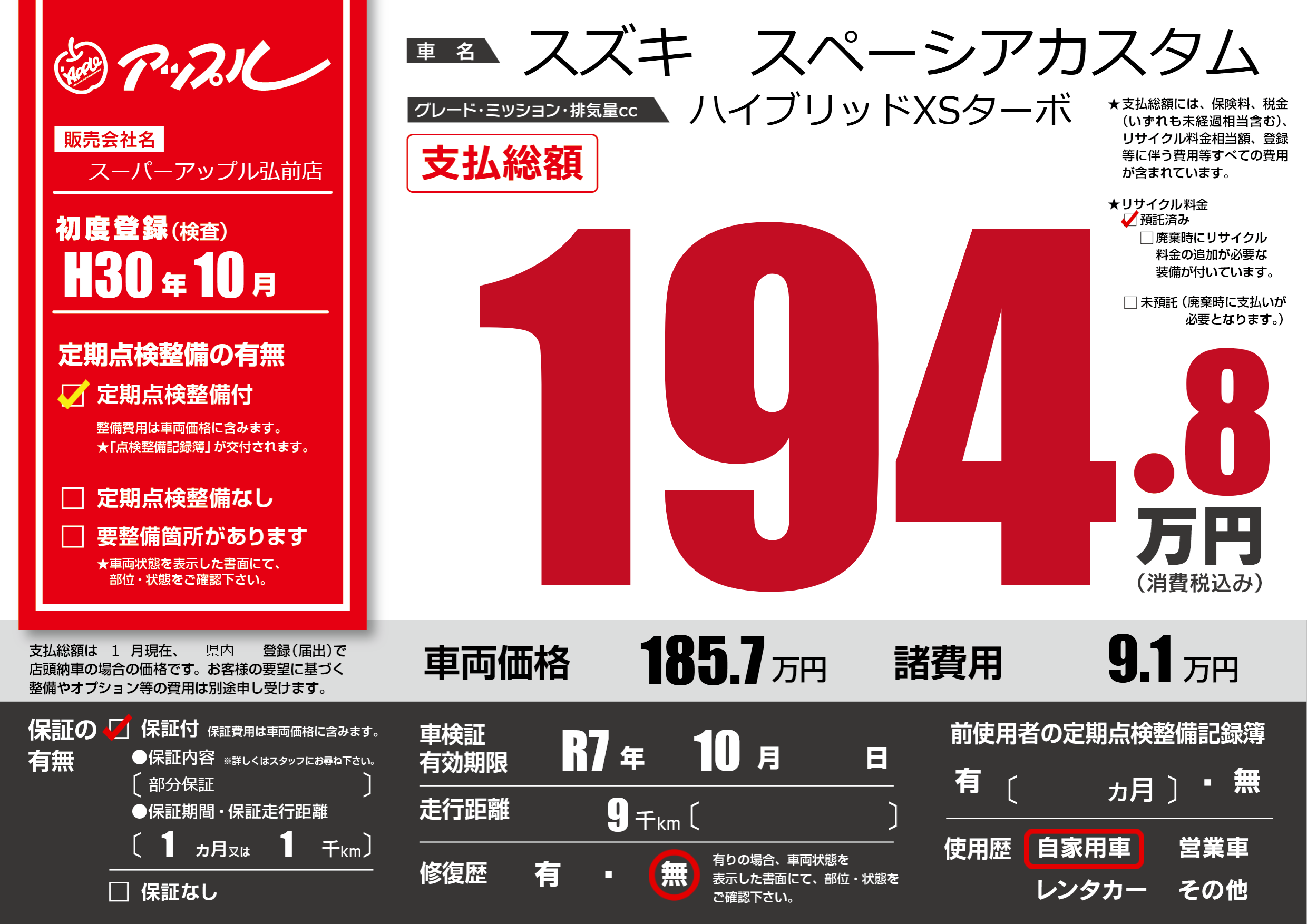 | 車検制限 | R7年 10月 - 日 | ||