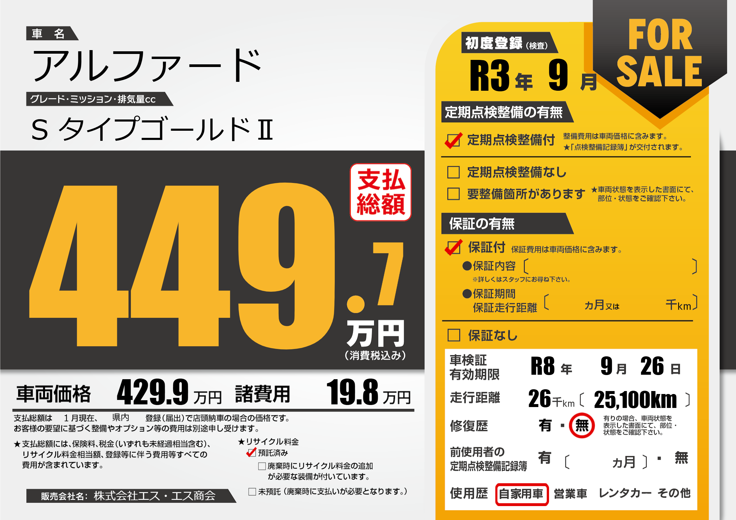 | 走行キロ | 2.6万km | 初年度登録 | R3年9月 |