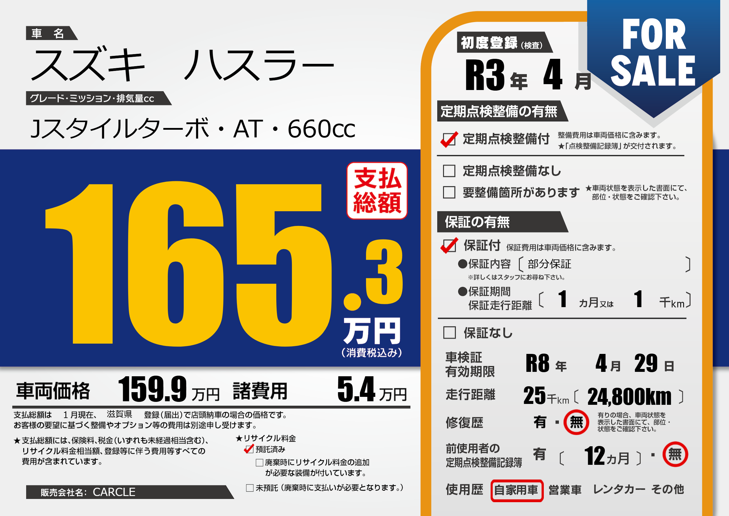| 車名 | スズキ ハスラー | グレード ミッション 排気量 |