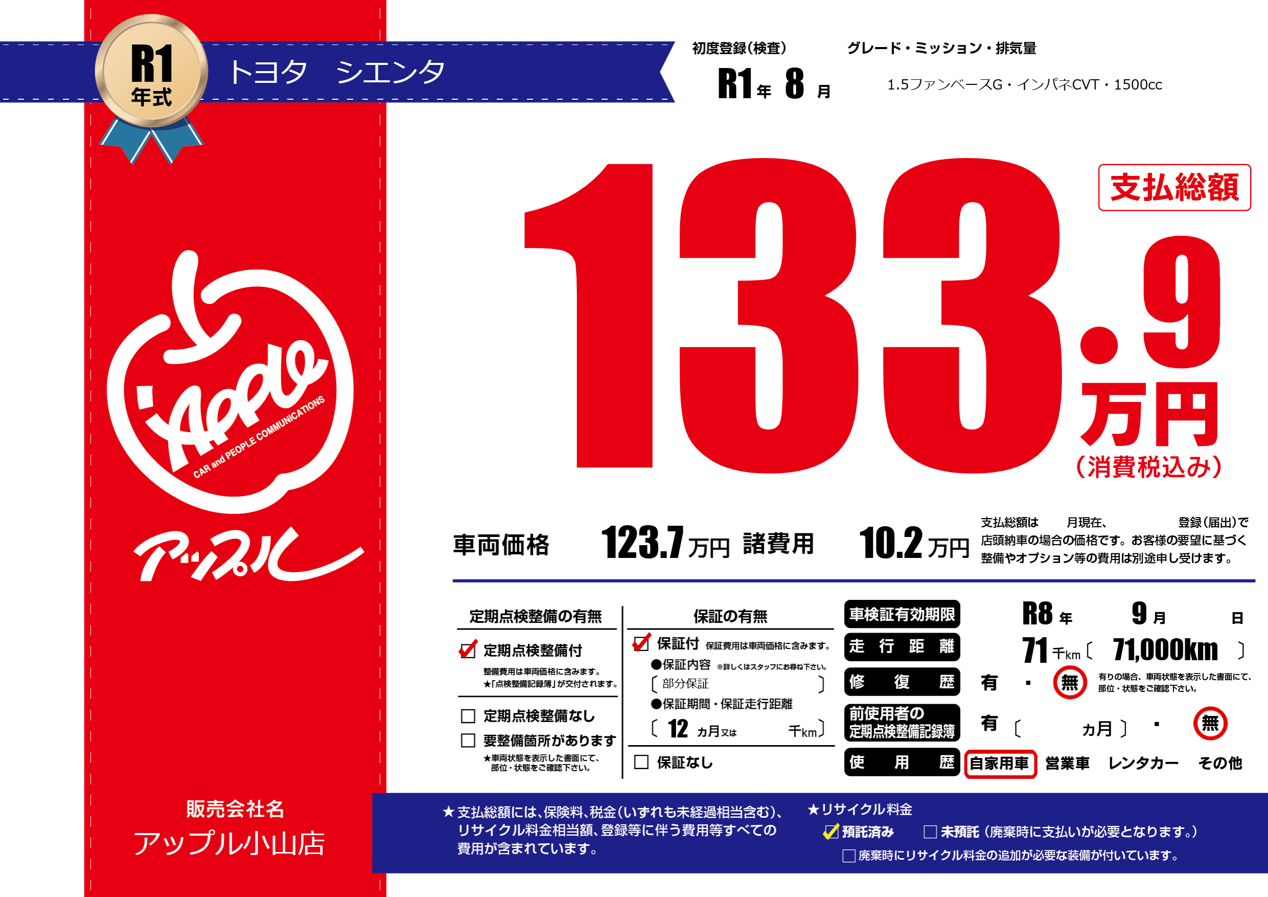 なし | 車検制限 | R8年9月---月 |