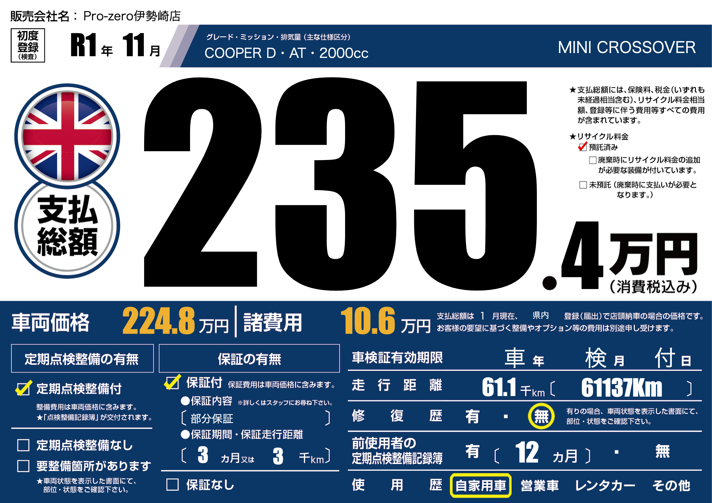 | 車名 | MINI CROSSOVER | グレード ミッション 排気量 |