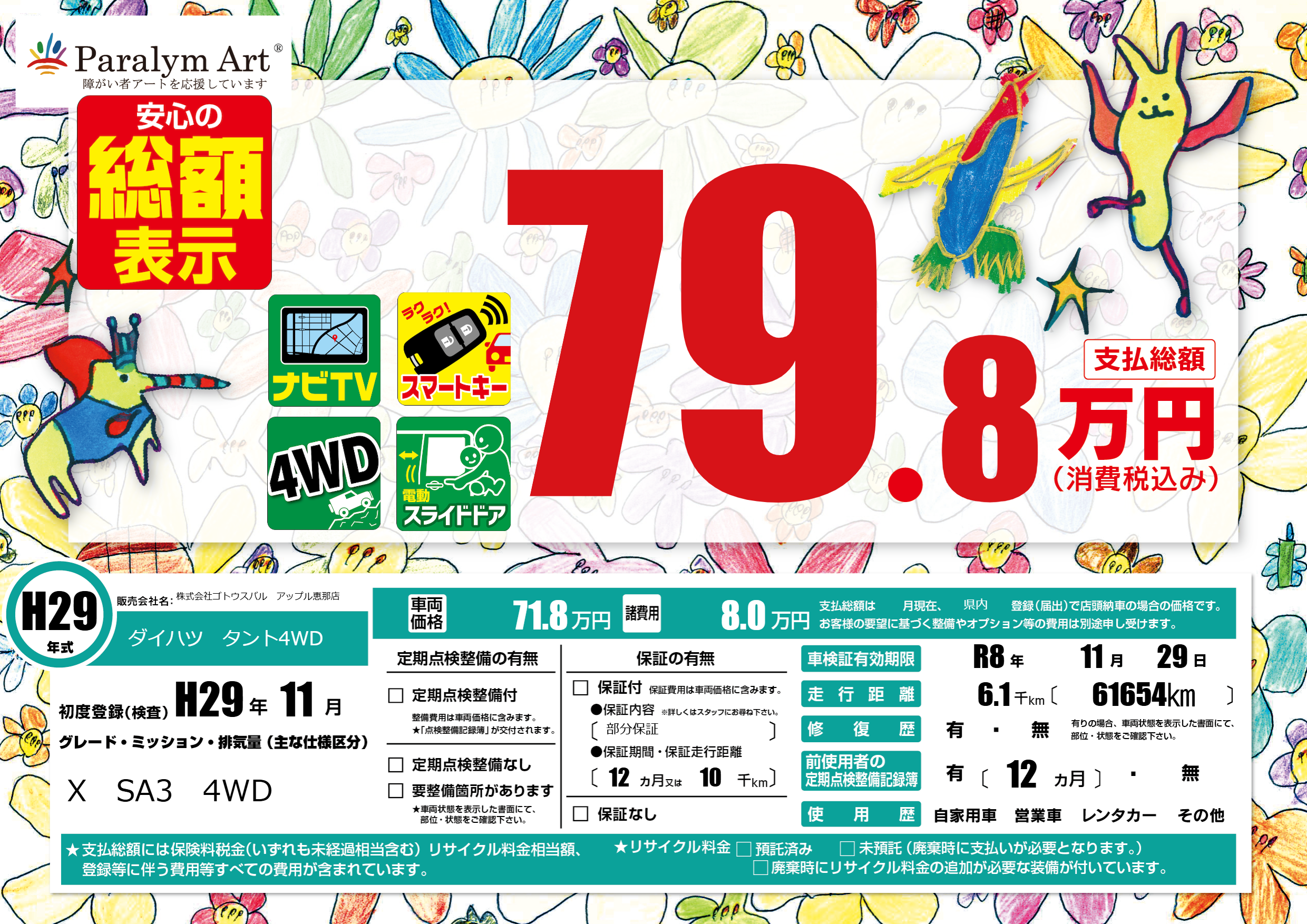 | 車名 | ダイハツ タント4WD | グレード ミッション 排気量 |