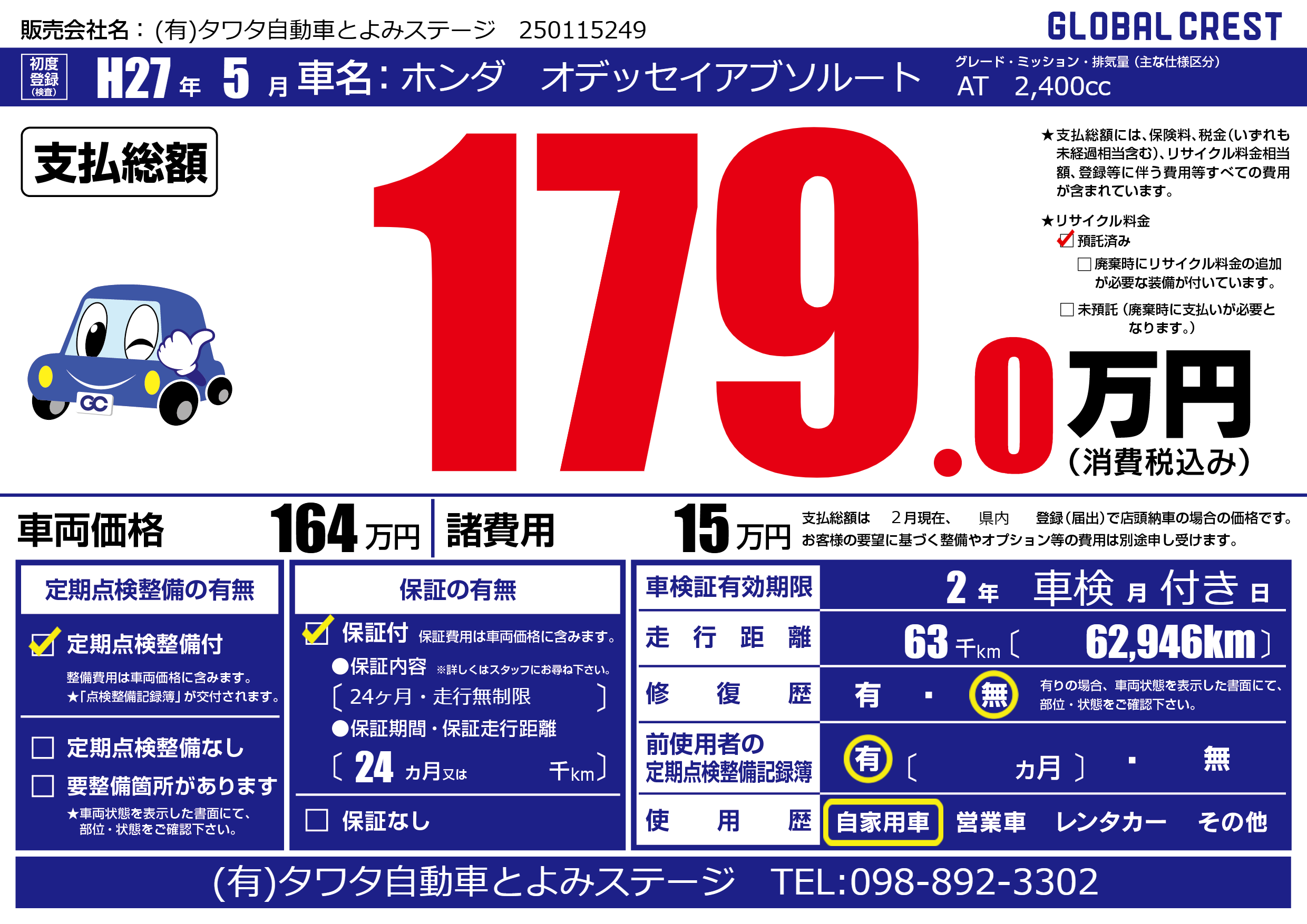 | 車名 | ホンダ オデッセイアブソルート | グレード ミッション 排気量 |