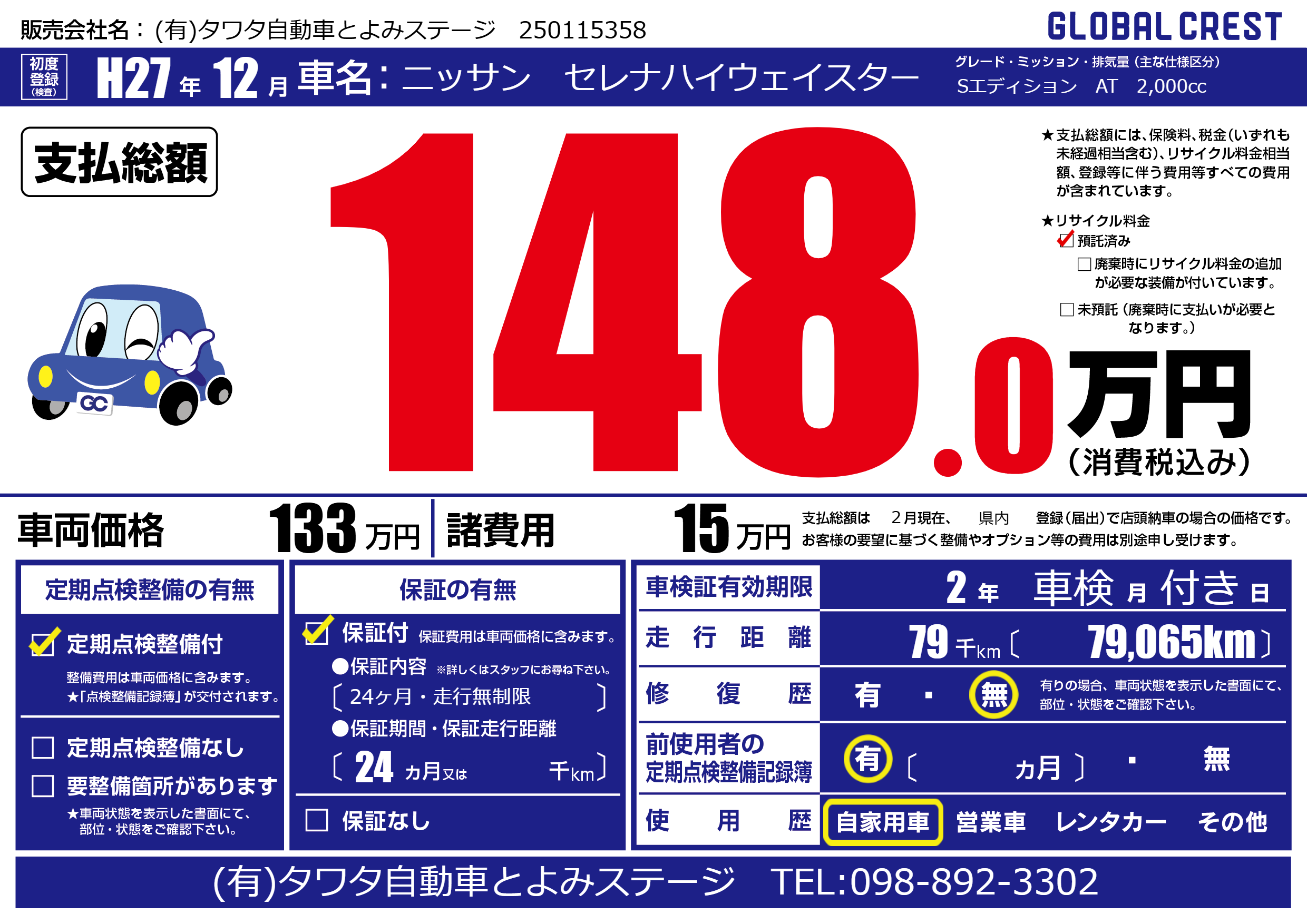 | 走行キロ | 7.9万km | 初年度登録 | H27年12月 |