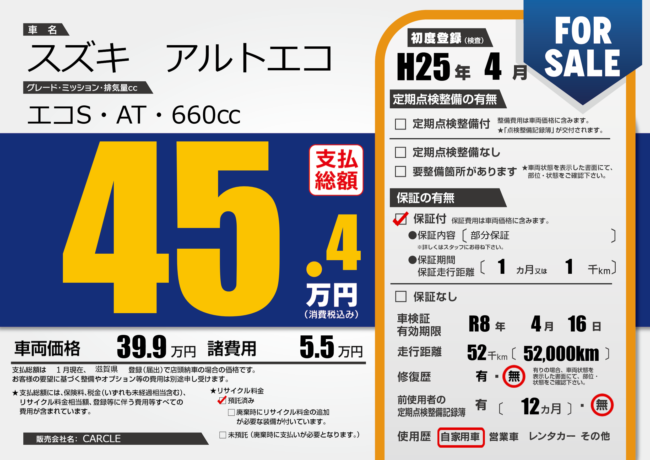 | 車名 | スズキ アルトエコ | グレード ミッション 排気量 |