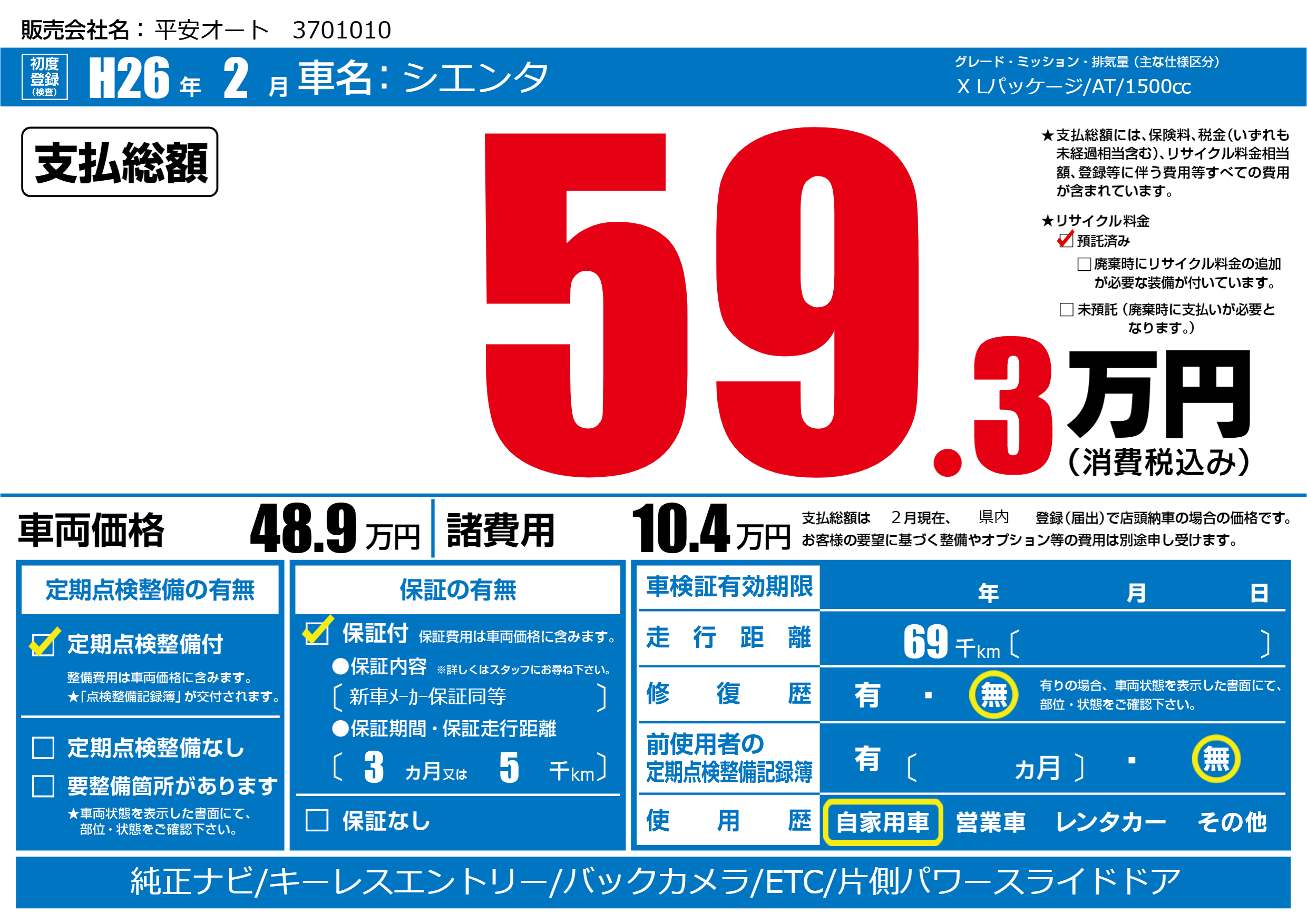 | 車名 | シエンタ | グレード ミッション 排気量 |