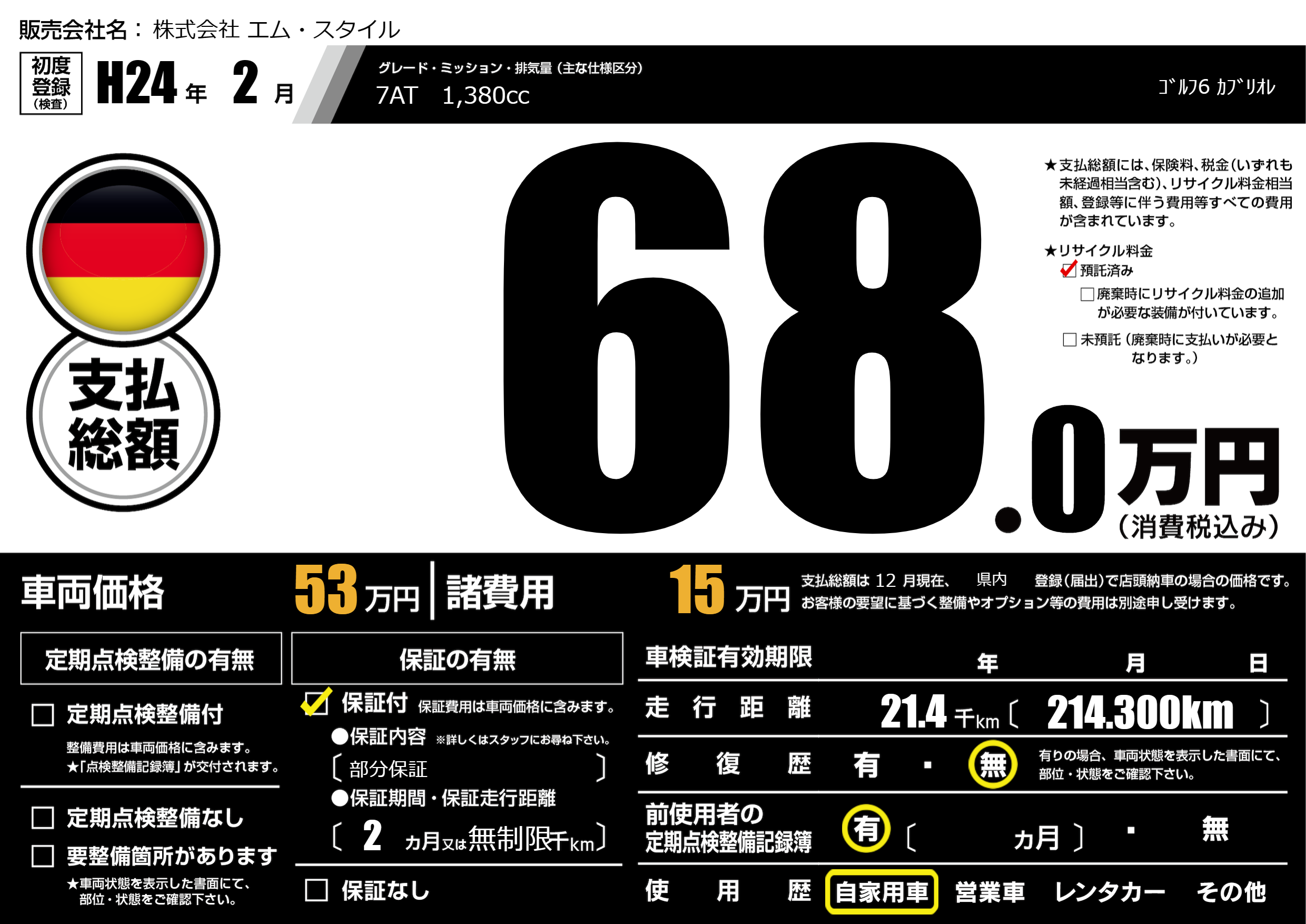 | 走行キロ | 2.1万km | 初年度登録 | H24年2月 |