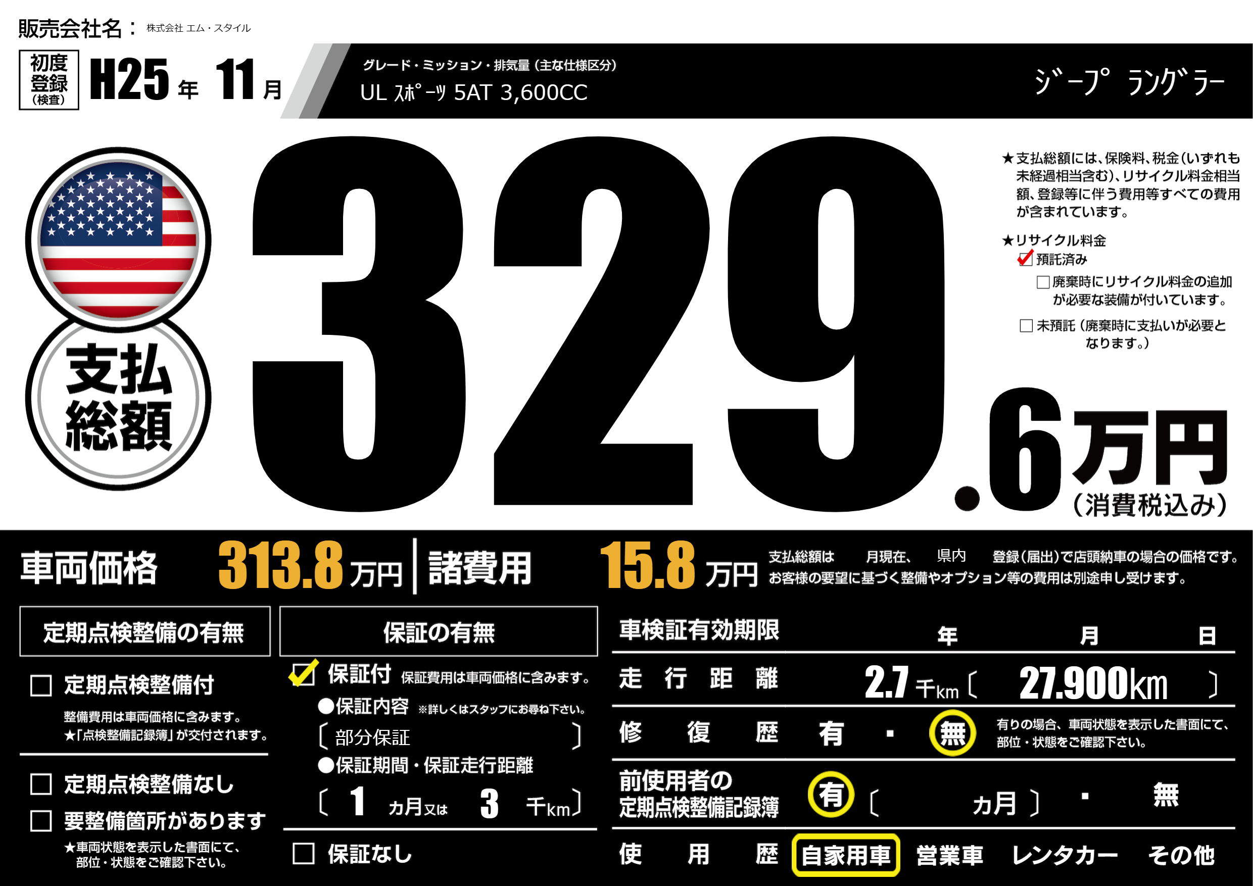| 車名 | ジープ ラングラー | グレード ミッション 排気量 |