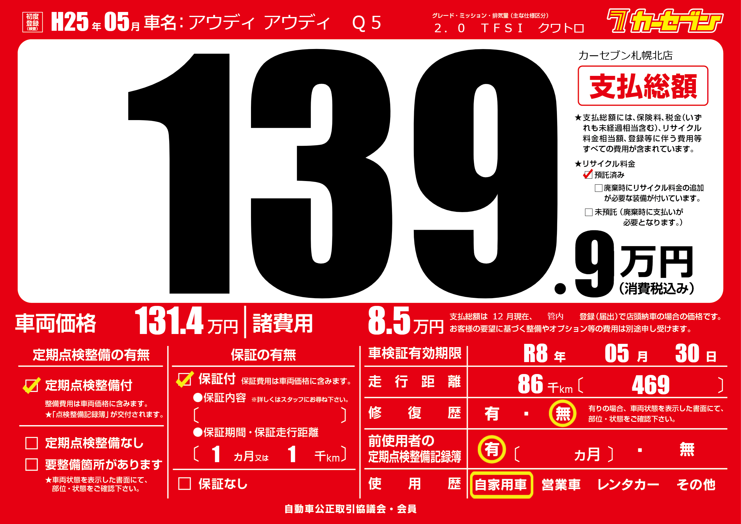 | 車名 | アウディ アウディ Q5 | グレード ミッション 排気量 |