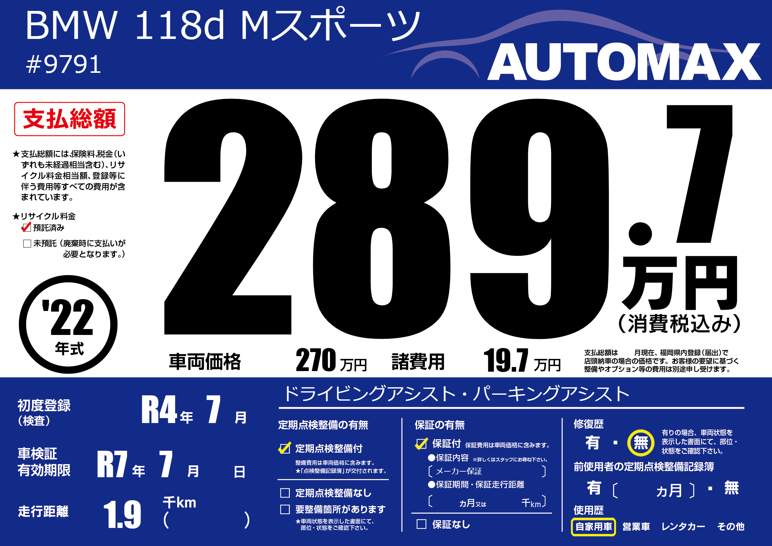 | 車名 | BMW 118d Mスポーツ | グレード ミッション 排気量 |