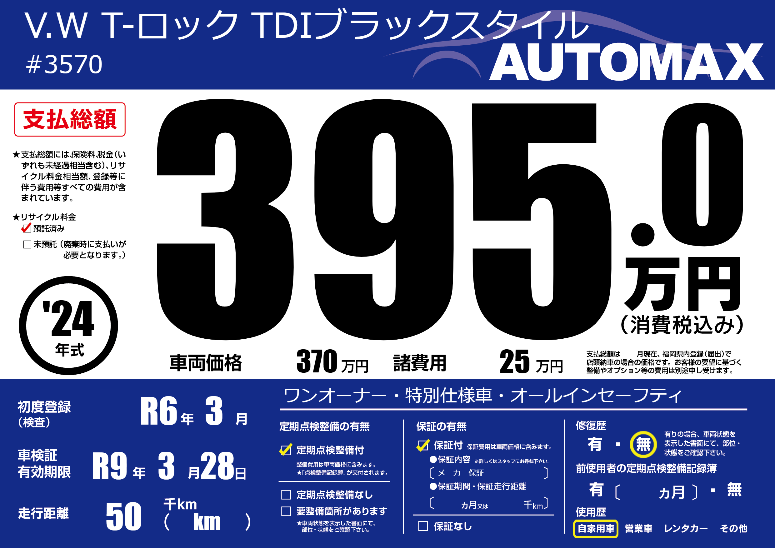 | 走行キロ | 5万km | 初年度登録 | R6年3月 |