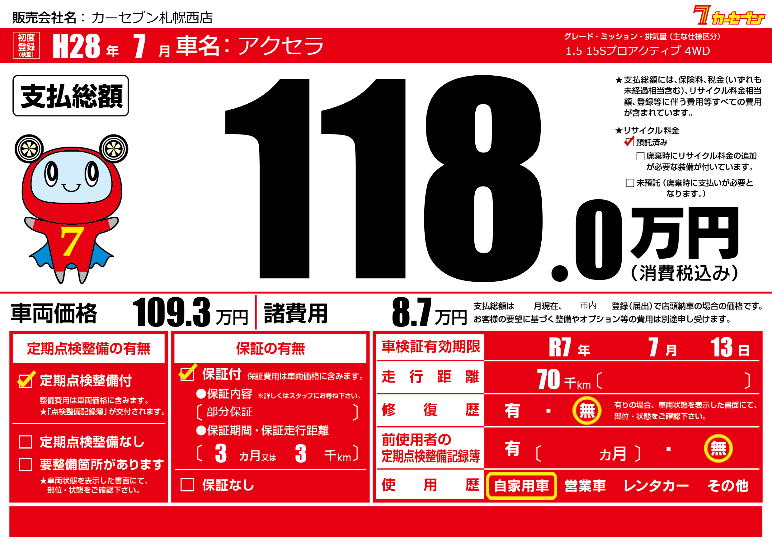 | 走行キロ | 7万km | 初年度登録 | H28年7月 |