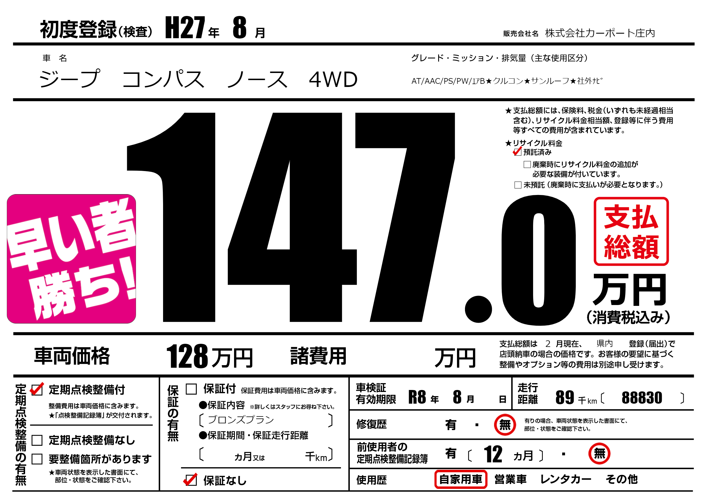 | 車名 | ジープ コンパス ノース 4WD | グレード ミッション 排気量 |
