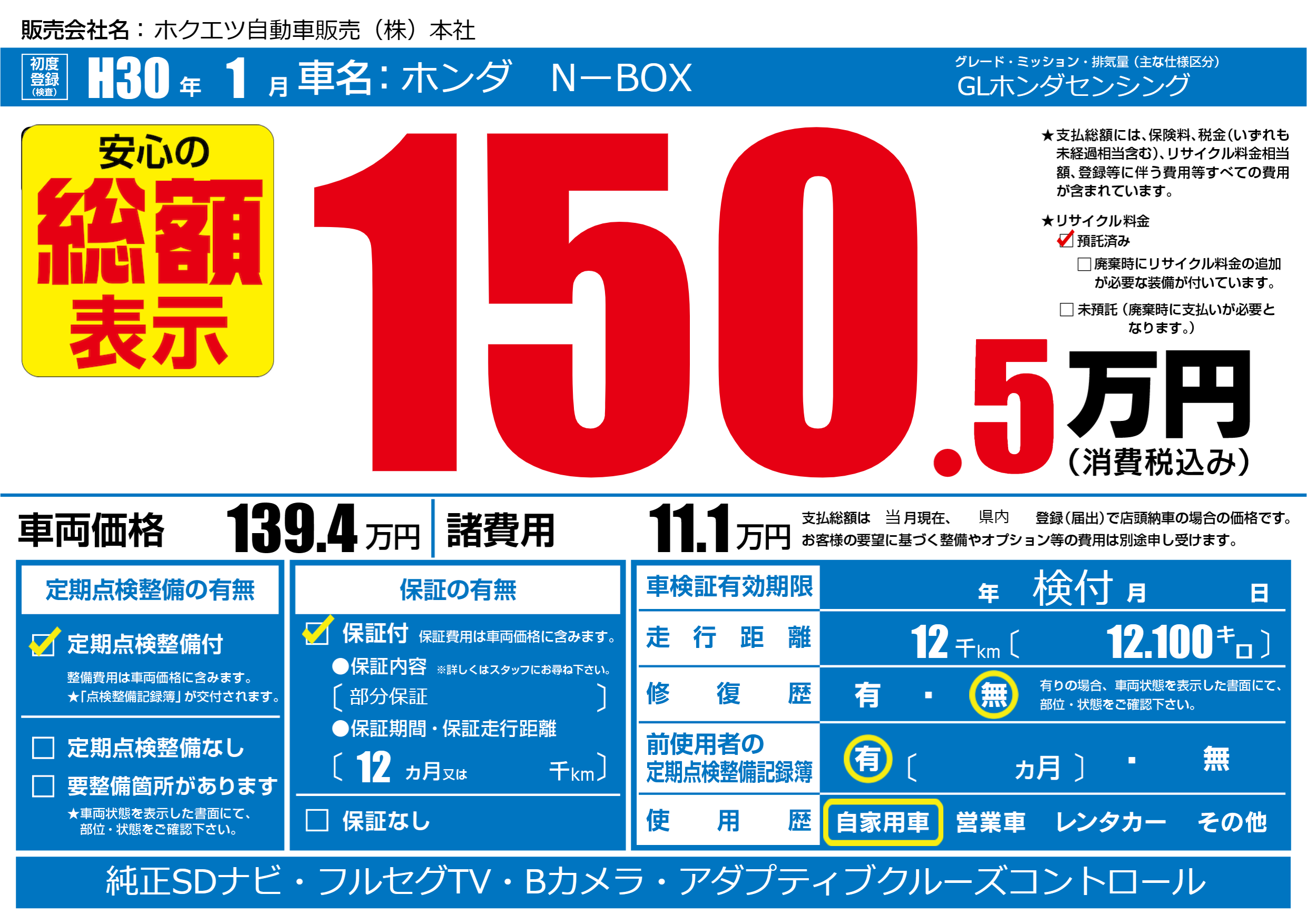 | 走行キロ | 1.2万km | 初年度登録 | H30年1月 |