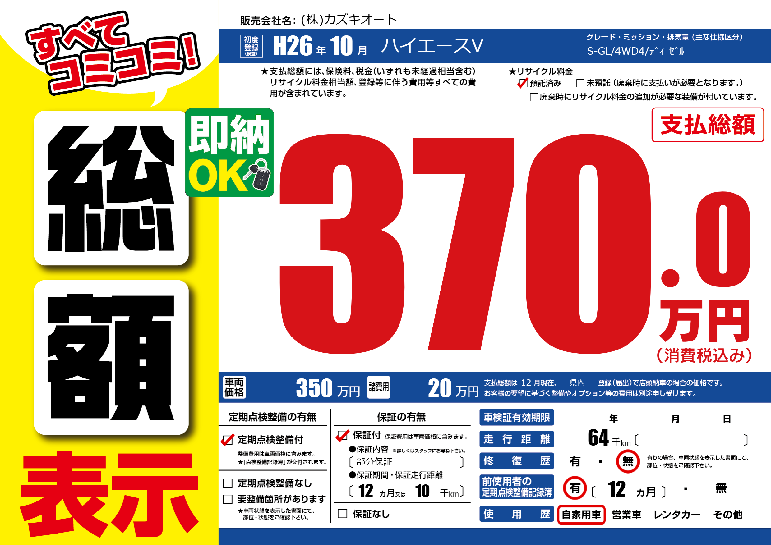 | 車名 | ハイエースV | グレード ミッション 排気量 |