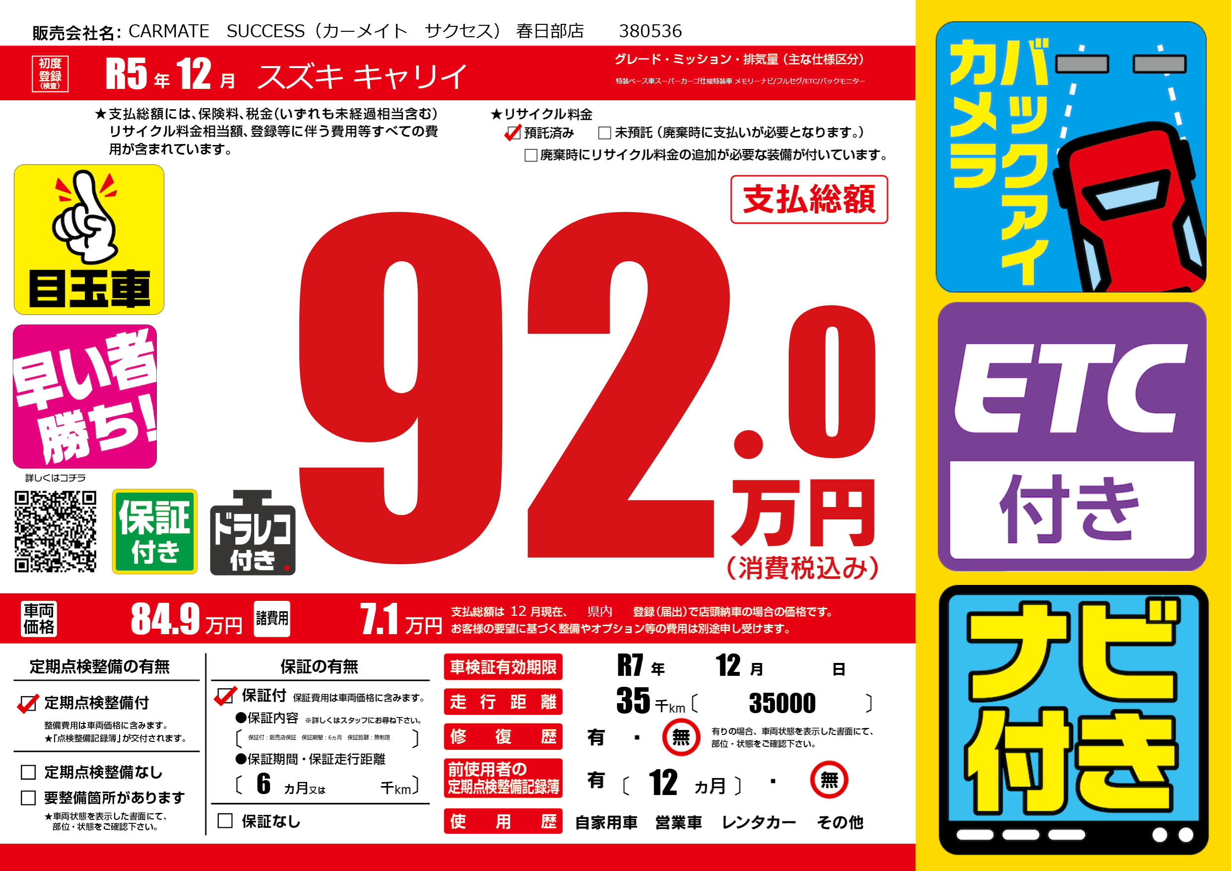 | 走行キロ | 3.5万km | 初年度登録 | R5年12月 |