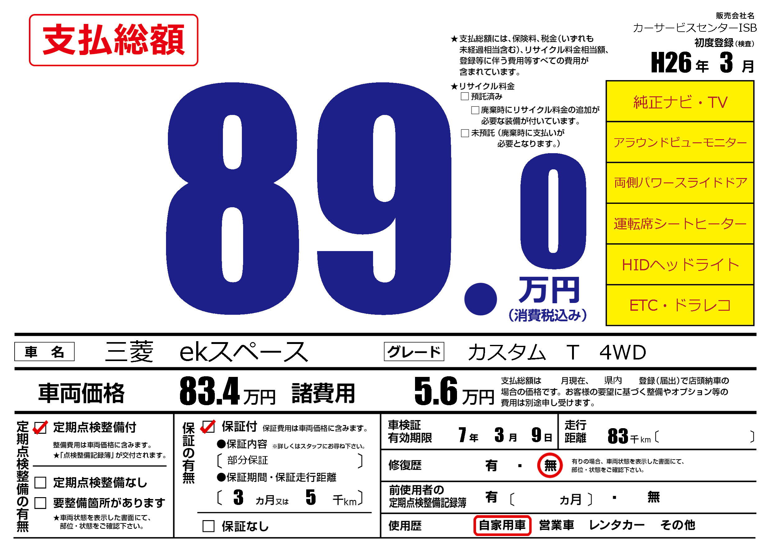 | 走行キロ | 8.3万km | 初年度登録 | H26年3月 |
