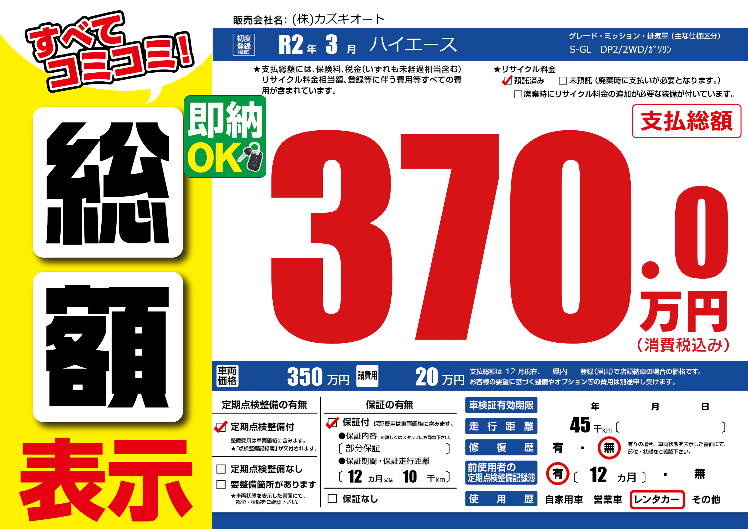 | 車名 | ハイエース | グレード ミッション 排気量 |