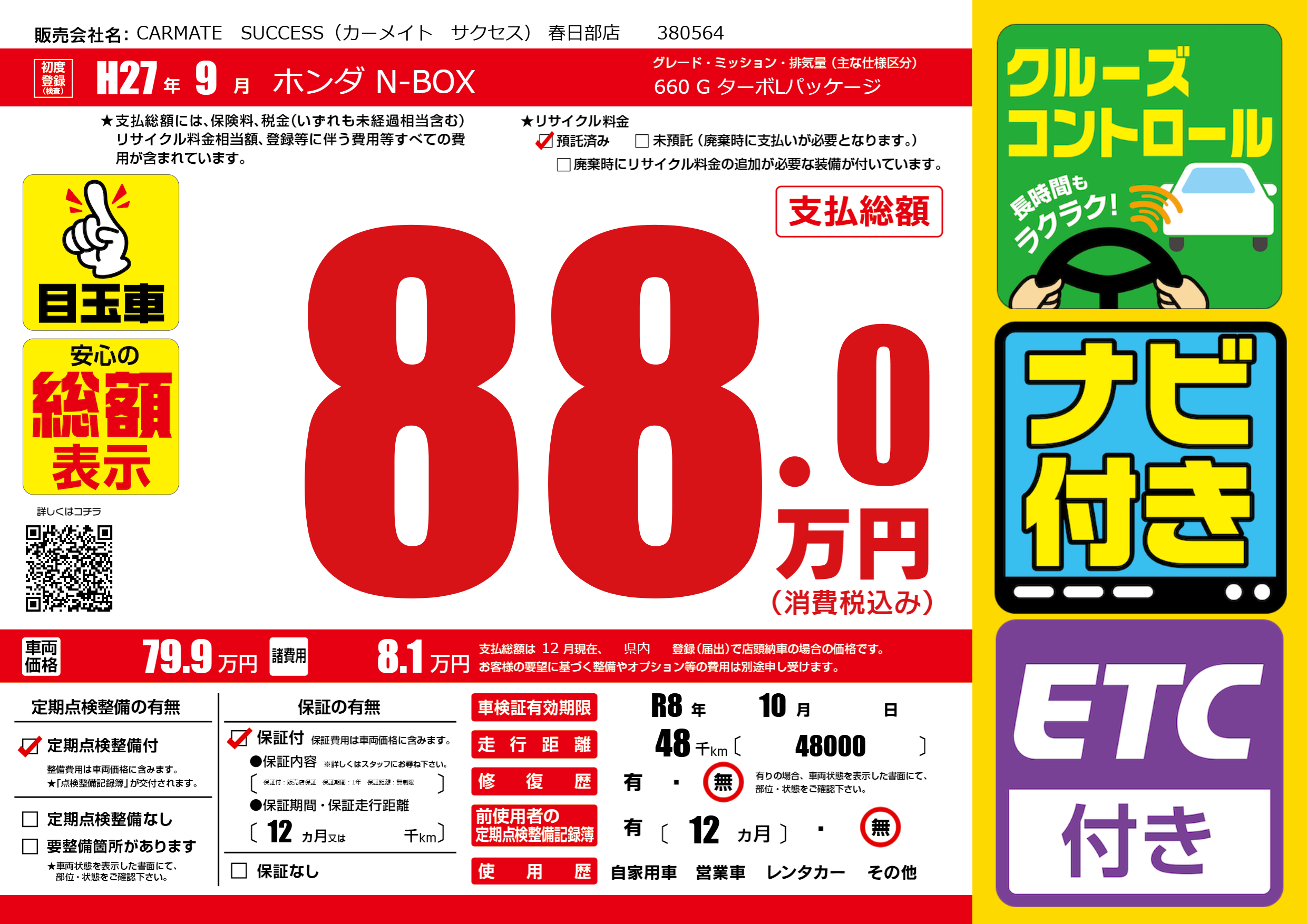 | 走行キロ | 4.8万km | 初年度登録 | H27年9月 |