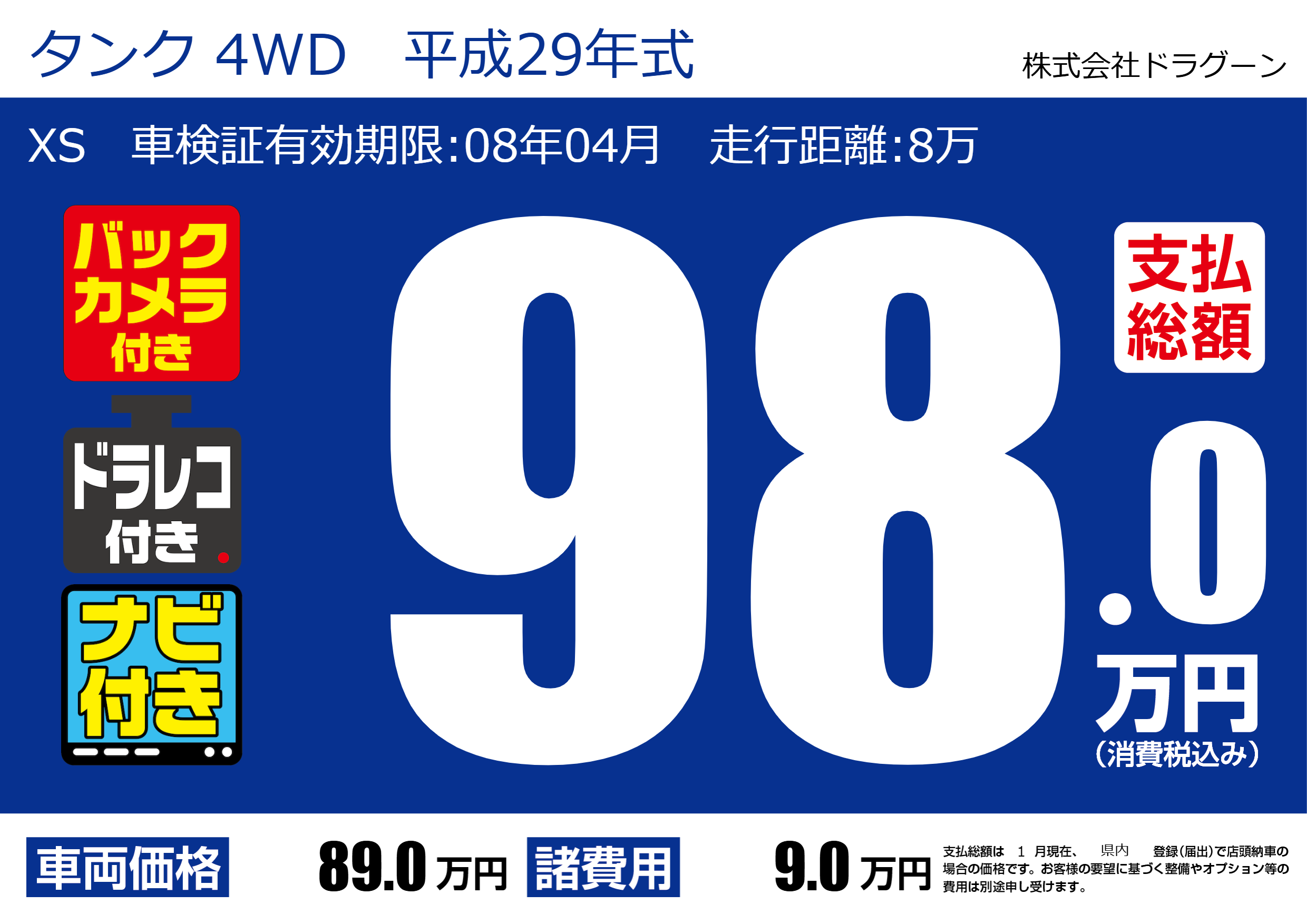 | 車名 | タンク 4WD 平成29年式 | グレード ミッション 排気量 |