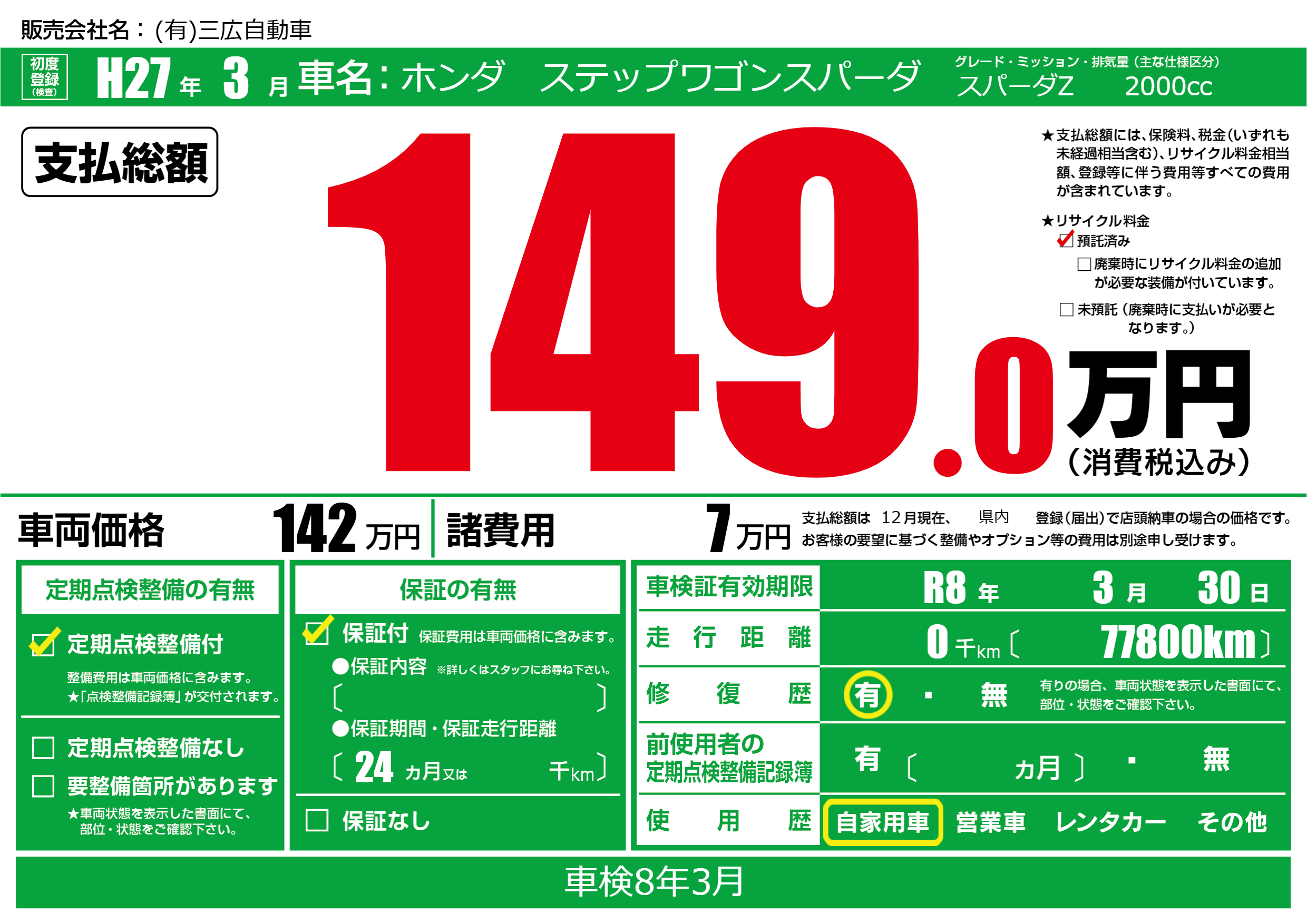| 車名 | ホンダ ステップワゴンスパーダ | グレード ミッション 排気量 |