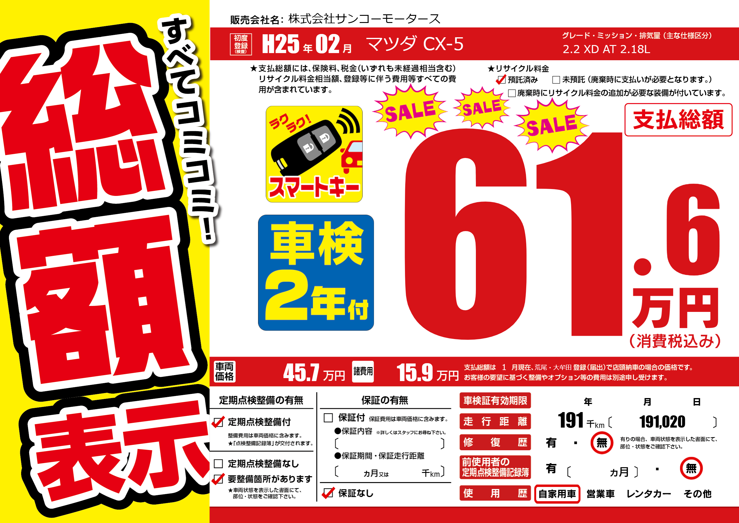 | 走行キロ | 19.1万km | 初年度登録 | H25年02月 |