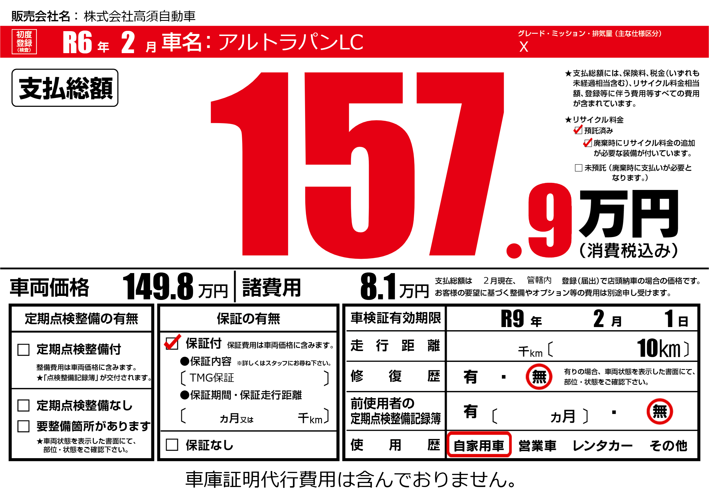 保証付き 保証内容(TMG保証) ---ヶ月または()千kmまで |