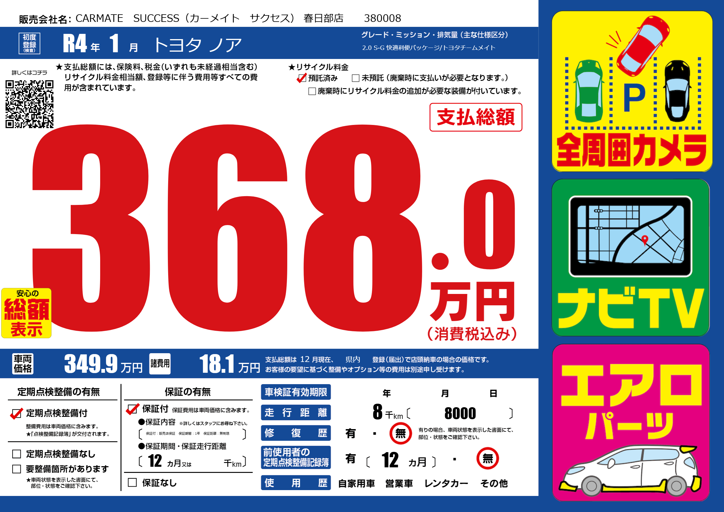 保証内容(保証付:販売店保証 保証期間:1年 保証距離:無制限) 12ヶ月または千km