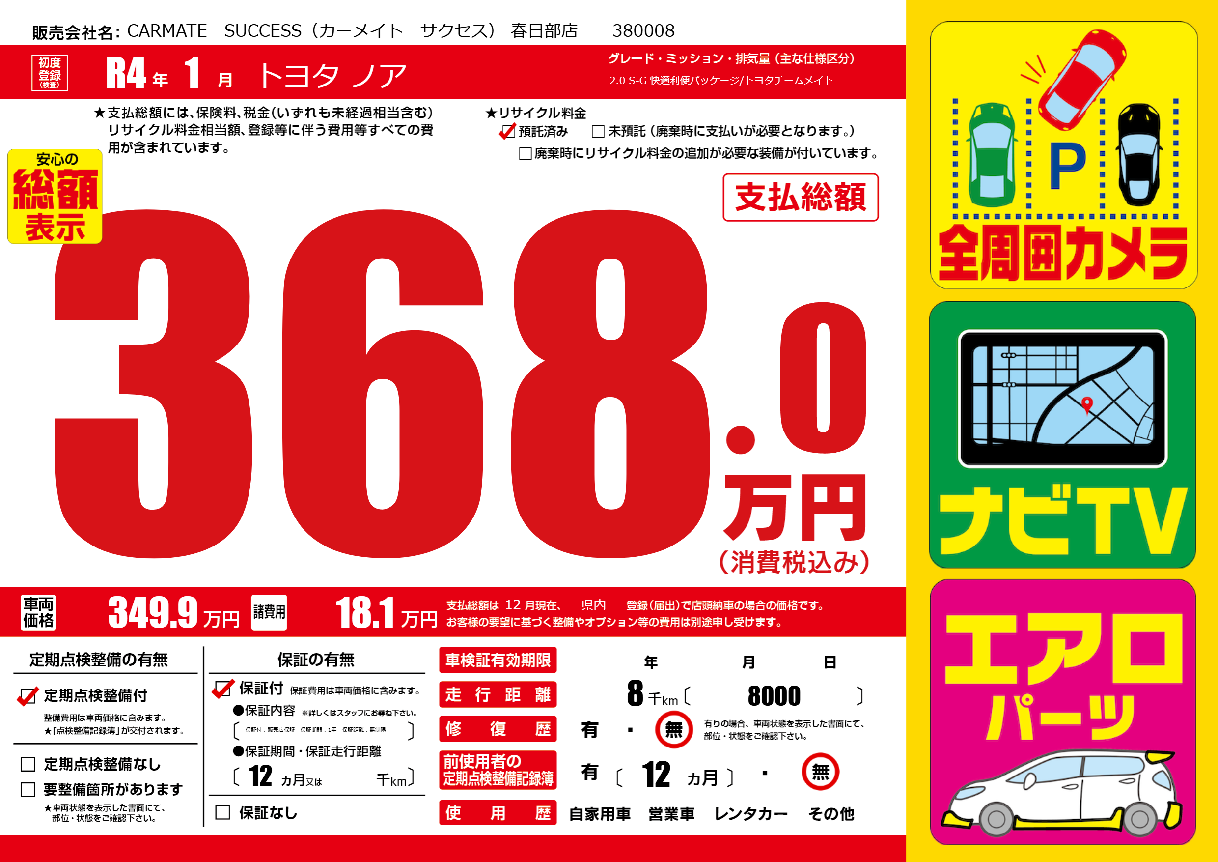 保証なし 保証内容(保証付:販売店保証 保証期間:1年 保証距離:無制限) 12ヶ月または()千kmまで |